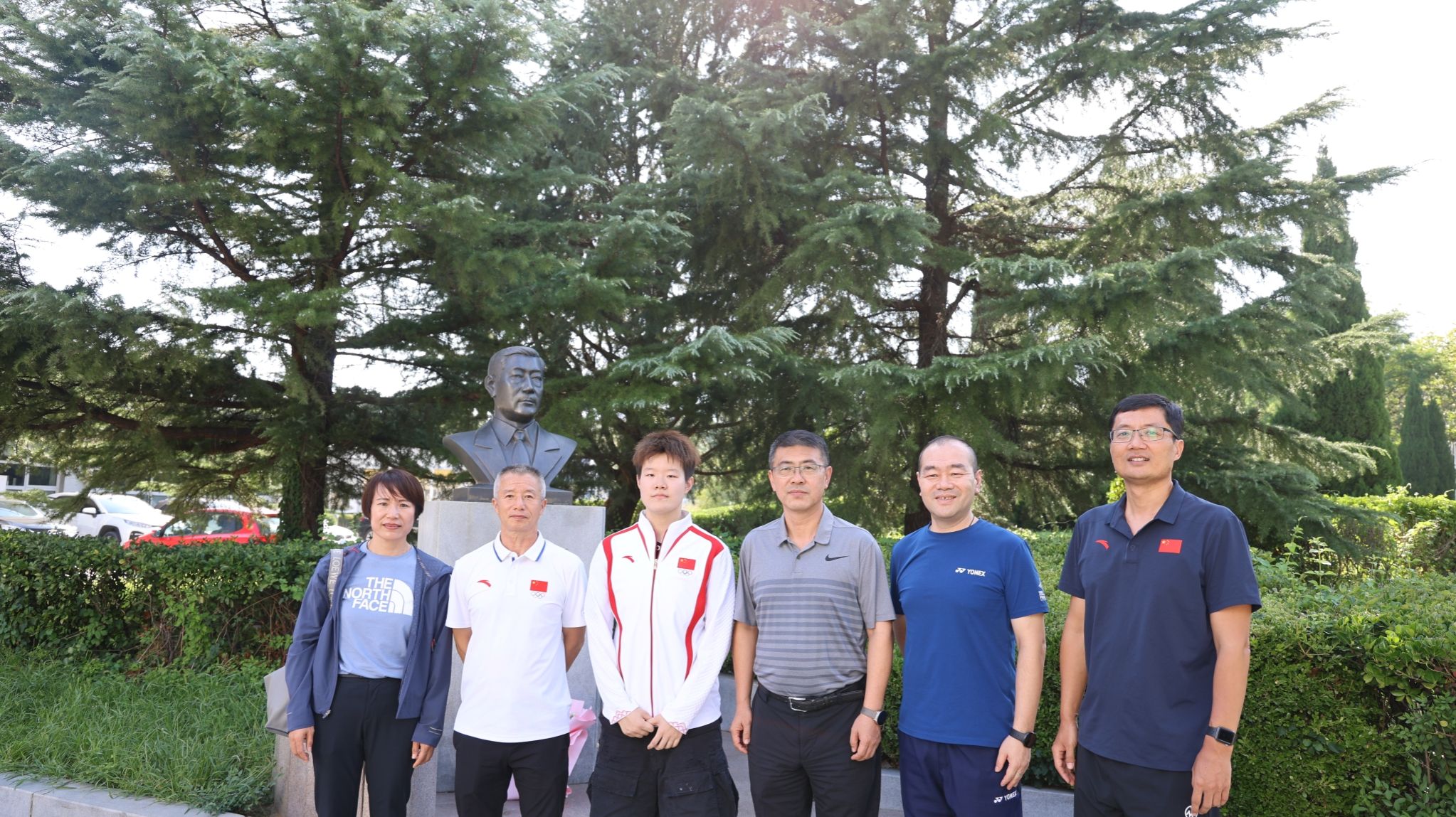 在学院老师陪同下,刘圣书为刘长春教授塑像献花,表示要传承刘长春精神,不断拼搏进取、挑战自我,为建设体育强国再立新功。