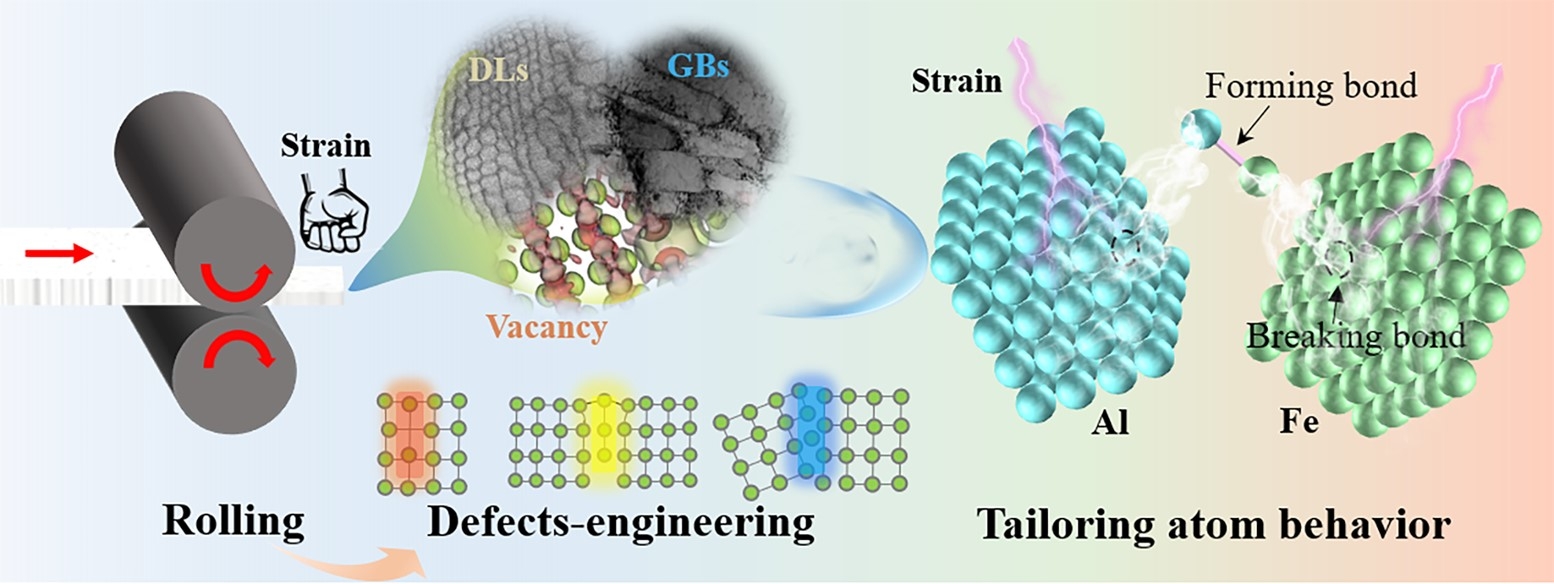 高性能Fe-Al异质结构符合高端装备轻量化发展需求,应用前景广阔。然而,在传统的热激发扩散状态下,原子迁移动力学具有滞缓的属性,导致Fe-Al异质结构成形制造受到严重制约。由于应变修饰的电子结构引入了高度的“非平衡”状态,该亚稳态可以促进空位生成及调控位错及晶界演化,从而调节原子迁移行为。但原子迁移过程中对晶格缺陷的精细结构敏感,因此,施加应变导致原子异常扩散的复杂性和特殊性。鉴于此,该研究团队提出了一种应变介导的缺陷工程诱导原子快速扩散策略,即通过累积轧制技术对Fe和Al施加应变,实现降低空位活化能并增强原子沿位错和晶界扩散行为的目的。