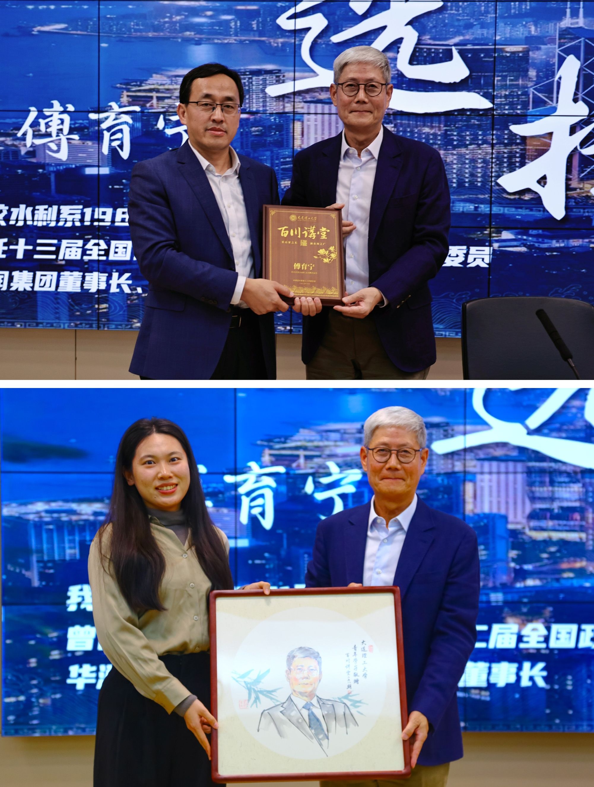 讲座最后,张言军代表学校为傅育宁颁发“百川讲堂”纪念牌;学生代表赠送国画肖像,以表感谢与敬意。