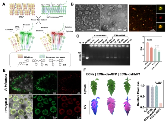 研究团队从细胞间“物流系统”——细胞外囊泡(Extracellular Vesicles,EVs)的结构和功能上获得启发,创新性地设计了一种由非磷脂阳离子脂质体(STEs)与植物叶片细胞膜提取物融合而成的新型嵌合纳米囊泡(Extracellular Vesicle Mimetic Chimeric Nanovesicles,简称 ECNs),并深入探究了其作为喷雾型RNA药物载体在作物保护方面的潜在应用价值。结果显示,ECNs巧妙整合了阳离子脂质体稳定负载dsRNA的能力与细胞膜组分高生物相容性的优点。以番茄晚疫病菌(Phytophthora infestans)为例,建立了靶向致病菌关键基因的喷雾型RNA药物体系,实现了药物的高效稳定装载与递送,并成功诱导病原菌基因沉默,实现对植物病害的有效治理。这一成果为解决SIGS策略在实际应用中的核心难题和开发新一代环境友好型RNA农药递送载体提供了新思路和新方法。