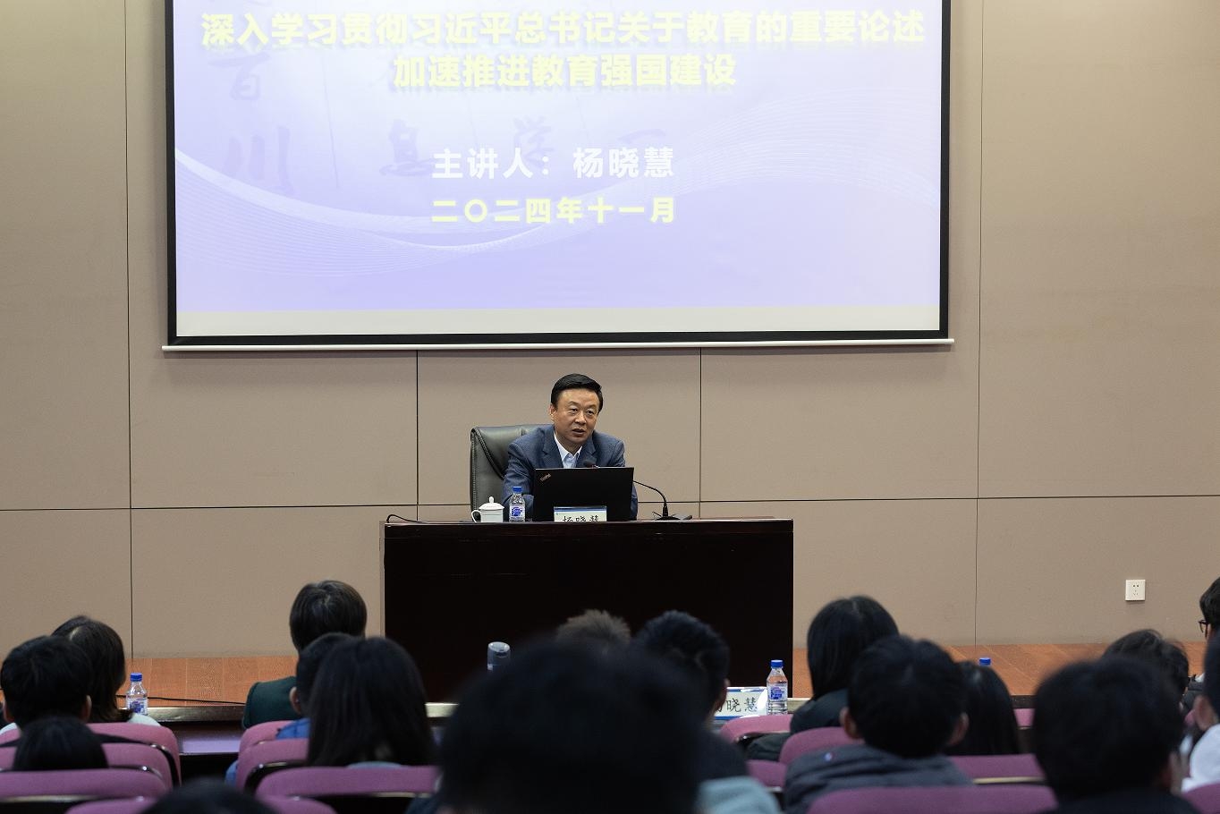 杨晓慧首先阐述了教育强国对强国建设的重要意义,特别是教育对于经济发展、科技进步、人才培养等领域发挥的基础性、先导性、全局性作用,介绍了其担任主编的教材《习近平总书记教育重要论述讲义》编写过程。随后,杨晓慧围绕战略视野、内容体系、重大意义三个方面讲述了习近平总书记关于教育的重要论述的理论体系,并从政治的高度、历史的厚度、教育的温度、哲学的深度、实践的力度五个方面,总结了习近平总书记关于教育的重要论述的时代价值。整篇报告视野开阔、深入浅出,充满思考和启迪。现场师生纷纷表示,自己对习近平总书记关于教育的重要论述,尤其是进一步建设教育强国、推进教育现代化、办好人民满意的教育有了全新的认识和更深层次的理解,受益匪浅。