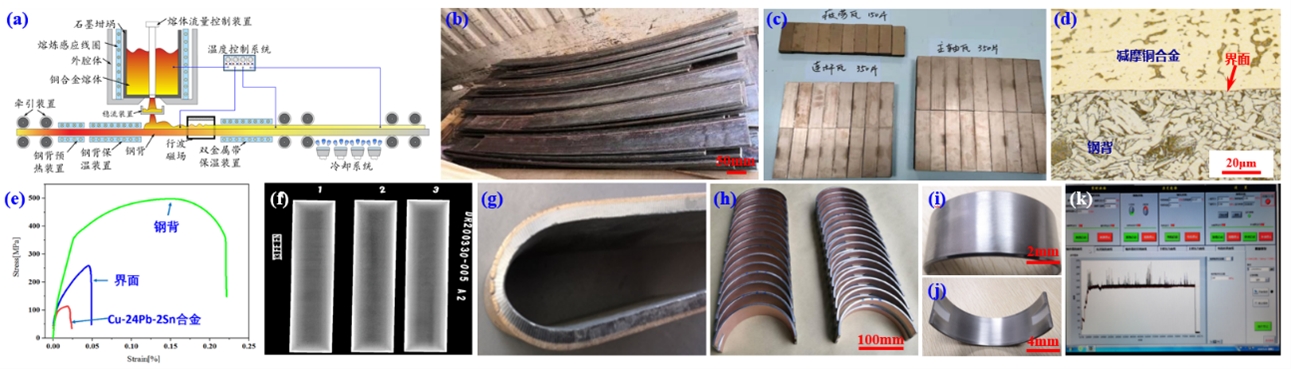 接金川教授等主持完成的项目“铜异质双金属连续固-液复合关键制备技术及工程化应用”,针对我国高性能双金属制备技术严重落后的瓶颈难题,发明了温度场、静/交变磁场等多场耦合同步辐射在线环境与观测技术,揭示了双金属界面冶金结合机制和难混溶减摩铜合金组织控制机理。研制了国内首台套高承载轴瓦用减摩铜合金/钢背双金属的固-液复合装备,开发了钢背超快速感应加热、电磁力辅助熔体铺展/界面原子互扩散、梯度水冷的水平连续固-液复合技术,采用该双金属带制备的高承载轴瓦达到了国际先进水平,填补了高承载轴瓦的国内空白。项目支撑了我国高性能滑动轴承双金属基材制备技术的发展。