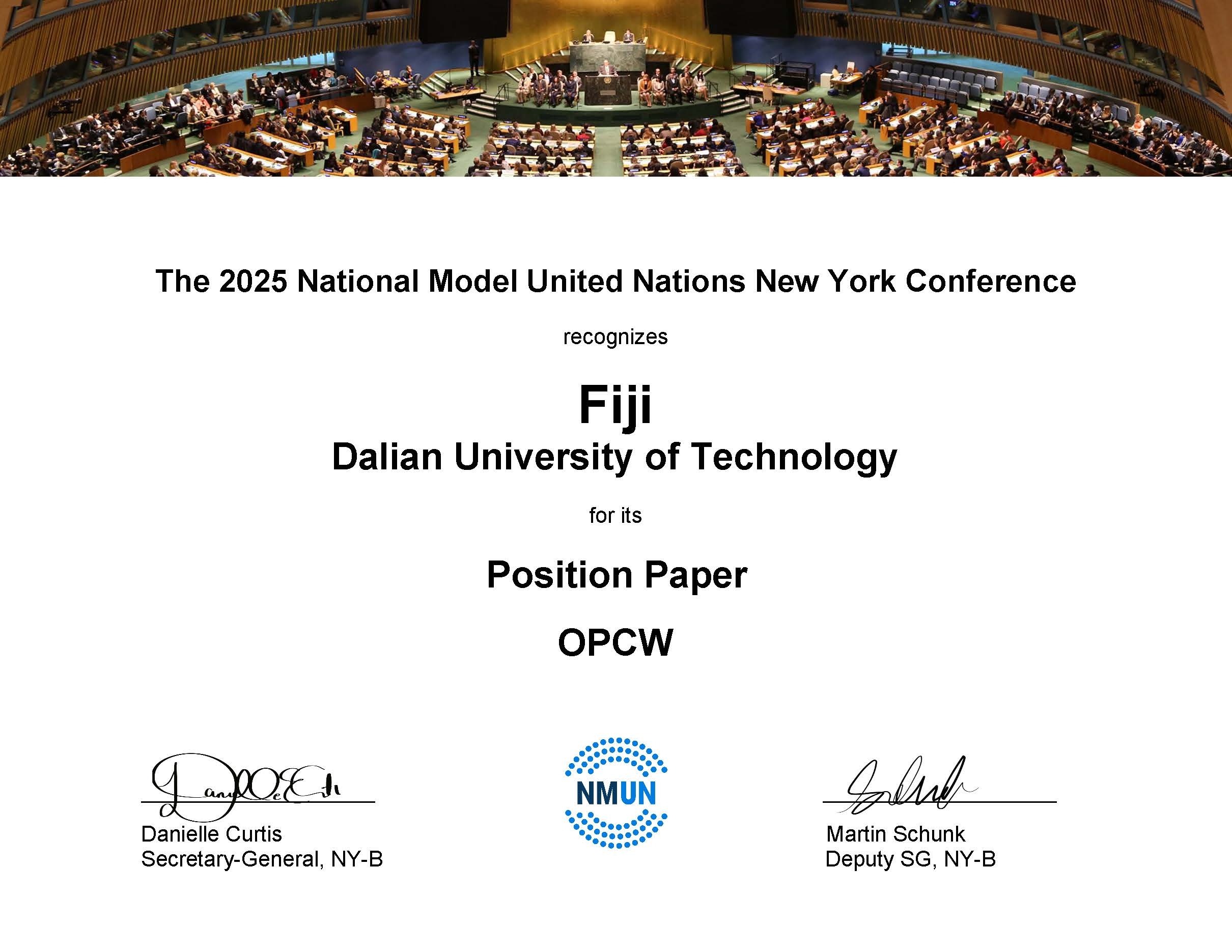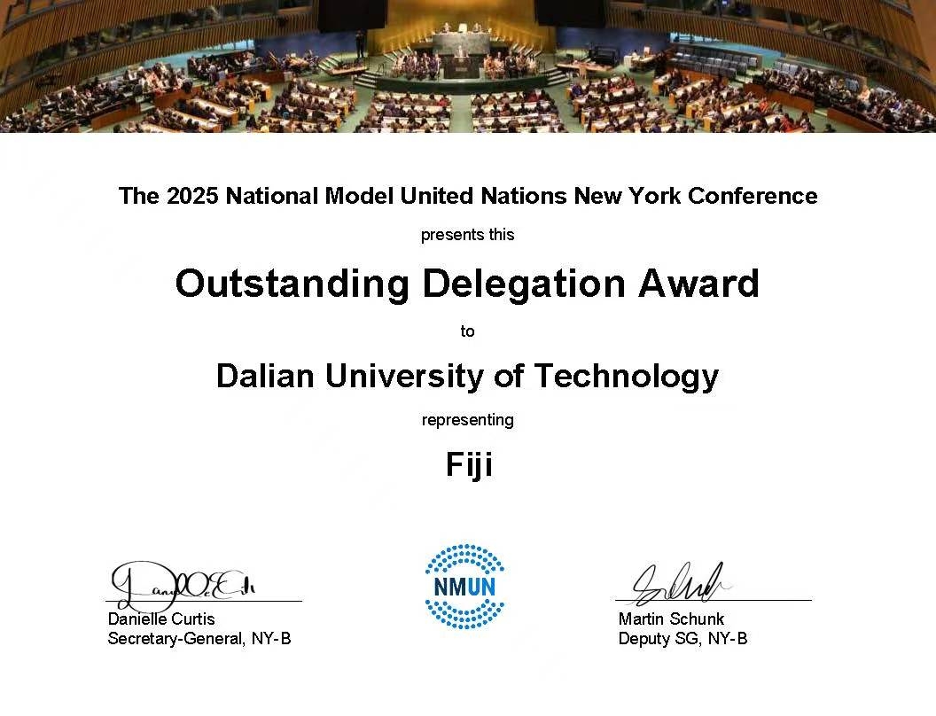 本次纽约全美模拟联合国大会于4月13日至17日在纽约举办,大会设专门评审团,根据各代表团参与委员会的表现、贡献及成果等综合评选出获奖团队。经大会组委会指定,此次我校代表团代表斐济参会,与会期间的表现得到组委会和各国代表一致好评,成为获此奖项的亚洲唯一高校。