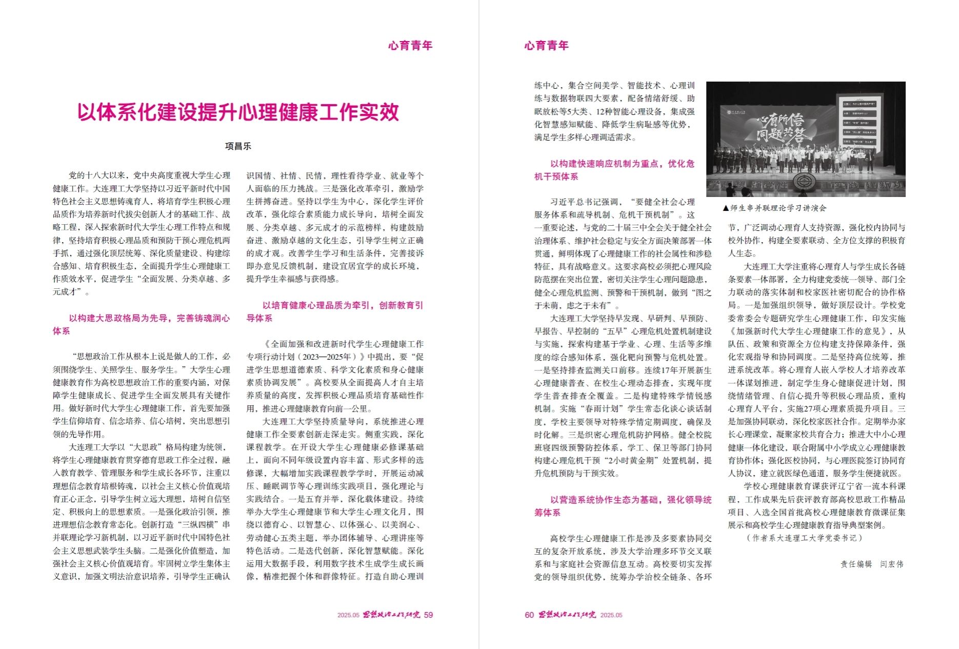 近日,党委书记项昌乐在《思想政治工作研究》期刊上,围绕学校构建“大思政”格局,体系化提升心理健康工作实效,培养新时代拔尖创新人才工作发表署名文章,全文如下: