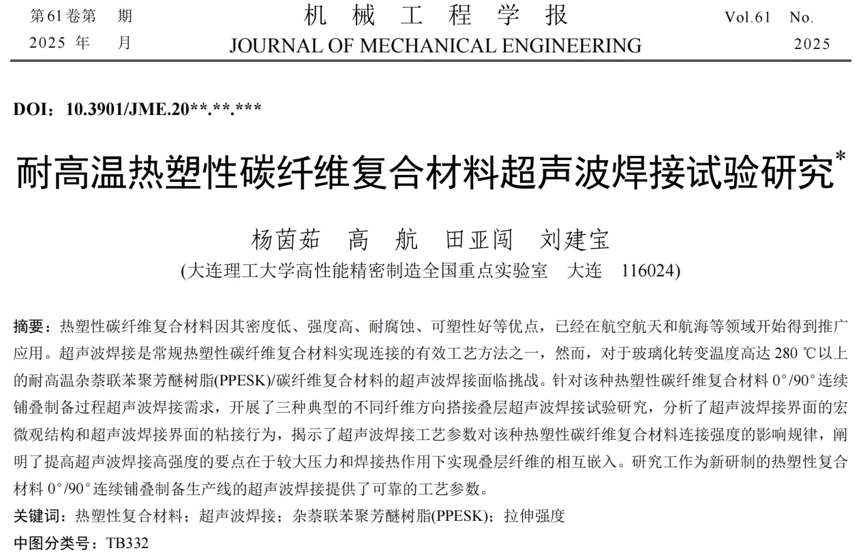 近日,我校机械工程学院大四本科生杨茵茹同学通过课余时间积极参与学院高航教授课题组科研项目,针对我校蹇锡高院士团队研制的耐高温杂萘联苯聚芳醚树脂基热塑性碳纤维复合材料0°/90°连续铺叠制备过程对超声波焊接的需求,开展了系统的试验研究。研究成果为机械工程学院成功研制我国首台套耐高温热塑性复合材料0°/90°连续铺叠制备生产线提供了可靠的工艺参数。该研究成果以《耐高温热塑性碳纤维复合材料超声波焊接试验研究》为题发表于国内机械工程领域权威学术期刊《机械工程学报》。