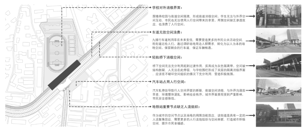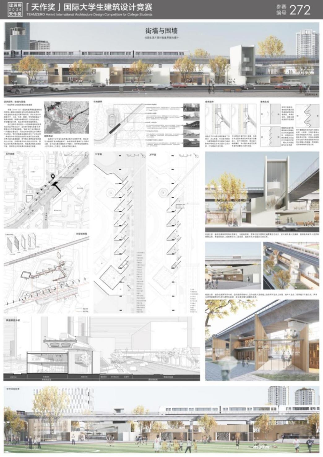 获奖作品《街墙与围墙》,聚焦城市街道与校园空间的关联。当下中国城市里,小区、学校等围墙割裂了连续街墙,影响步行体验。作品选取对围墙依赖度高的中学校园进行优化,以“缩街”理念,在校园与街道边界增设设施,推动二者渗透融合。例如,利用学校节假日闲置资源向公众开放,借助城市空间为高中生创造社会活动契机,满足双方需求,强化互动。