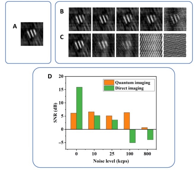 图2 噪声干扰下单像素量子成像实验结果。(A)激光照射条件下长时间曝光所获得的基准图像。在0、10、25、100和800 kcps噪声水平下通过(B)量子成像方法和(C)直接成像方法重建的图像(从左至右呈现)。(D)对应不同噪声水平下量子成像和直接成像所重建图像的信噪比。