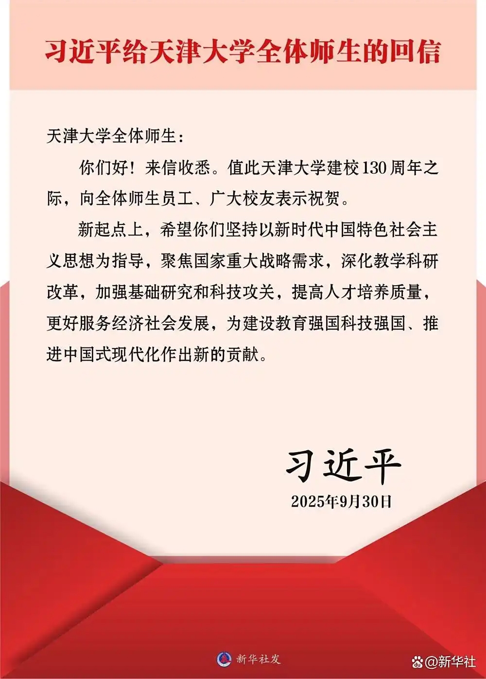 新华社北京10月2日电 近日,中共中央总书记、国家主席、中央军委主席习近平给天津大学全体师生回信,在天津大学建校130周年之际,向全体师生员工、广大校友表示祝贺。