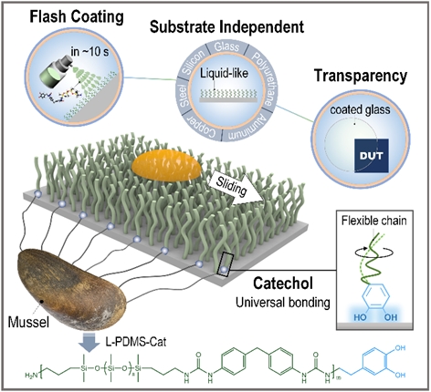 将柔性大分子锚定于光滑固体表面所构建的类液体表面(Liquid-like Surfaces, LLSs),为低黏表面技术带来了全新定义(Nat. Rev. Chem.7, 123-137, 2023)。与依赖复杂微纳结构的超疏水表面(Science346, 1096–1100, 2014)及液体灌注表面(Nature477, 443-447, 2011)不同,类液体表面无需借助表面纹理即可实现优异的抗黏附性能,突破了传统表面设计的局限。目前,类液体表面的构建主要依赖于柔性分子末端的硅醇基团(─SiOH)与表面羟基(─OH)之间的脱水缩合反应,形成稳定的Si─O共价键连接。然而,该策略在实际应用中仍面临三大挑战:1.基材适用性受限;2.反应条件复杂苛刻;3.引起金属基材腐蚀。因此,基于类液体表面的特性,开发一种无需催化剂、高温或复杂表面处理的通用型快速制备涂层,在短时间内实现柔性分子在不同基材上的高效锚定,具有重要的研究价值与应用前景。