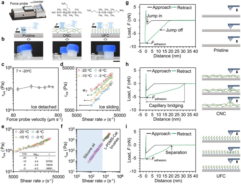 高度柔性的L-PDMS-Cat分子链能够通过简易喷涂工艺,在金属、无机及有机材料等多种基底表面快速固定形成聚合物刷,即通用闪固涂层(UFC)。该分子在表面的锚定作用源于儿茶酚基团与基底之间形成的多重相互作用,包括氢键、络合作用及π–π键。与此同时,分子另一端的Si–O–Si骨架凭借其极低的内旋转势垒,确保了分子链在接枝后仍能保持高度的动态柔性。得益于贻贝粘附机制的启发,该分子链锚定过程无需催化剂或苛刻工艺条件,在常温环境下仅需10秒即可完成类液体表面的构建。通过采用线性聚合物主链的有序设计(末端带有单个儿茶酚基团),锚定在表面的聚二甲基硅氧烷分子得以保持刷状、非交联的理想构象。这一结构特点使UFC表面呈现出类液体特性,具体表现为极低的液体接触角滞后(CAH Δθ5°),以及极低的冰剪切强度(τice= 16.7 ± 10.5 kPa)。