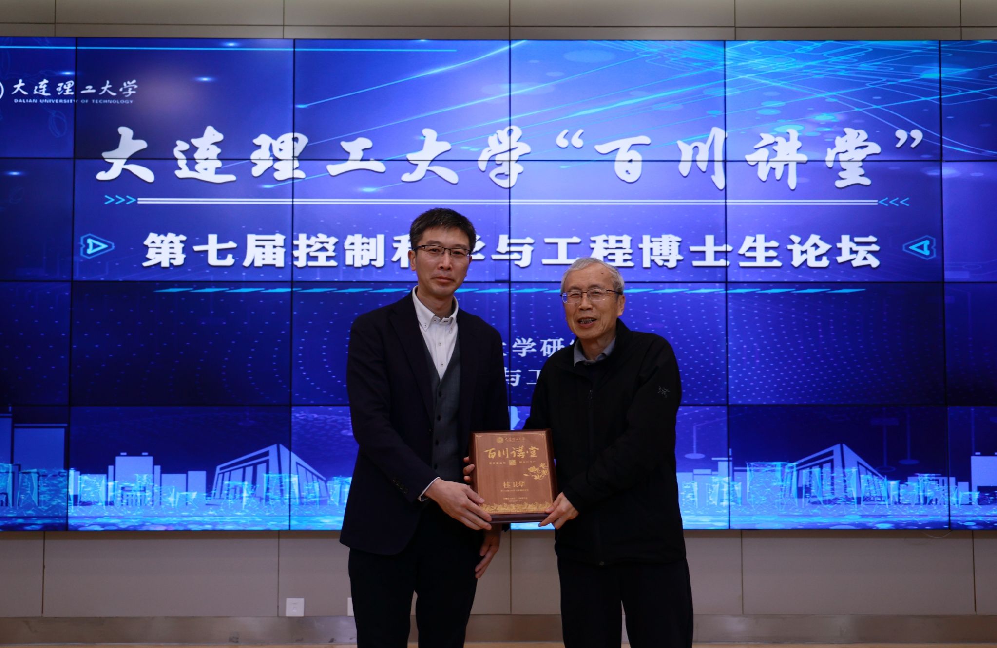 吴玉虎代表学校为桂卫华颁发“百川讲堂”纪念牌,学生代表赠送国画肖像,以表感谢与敬意。