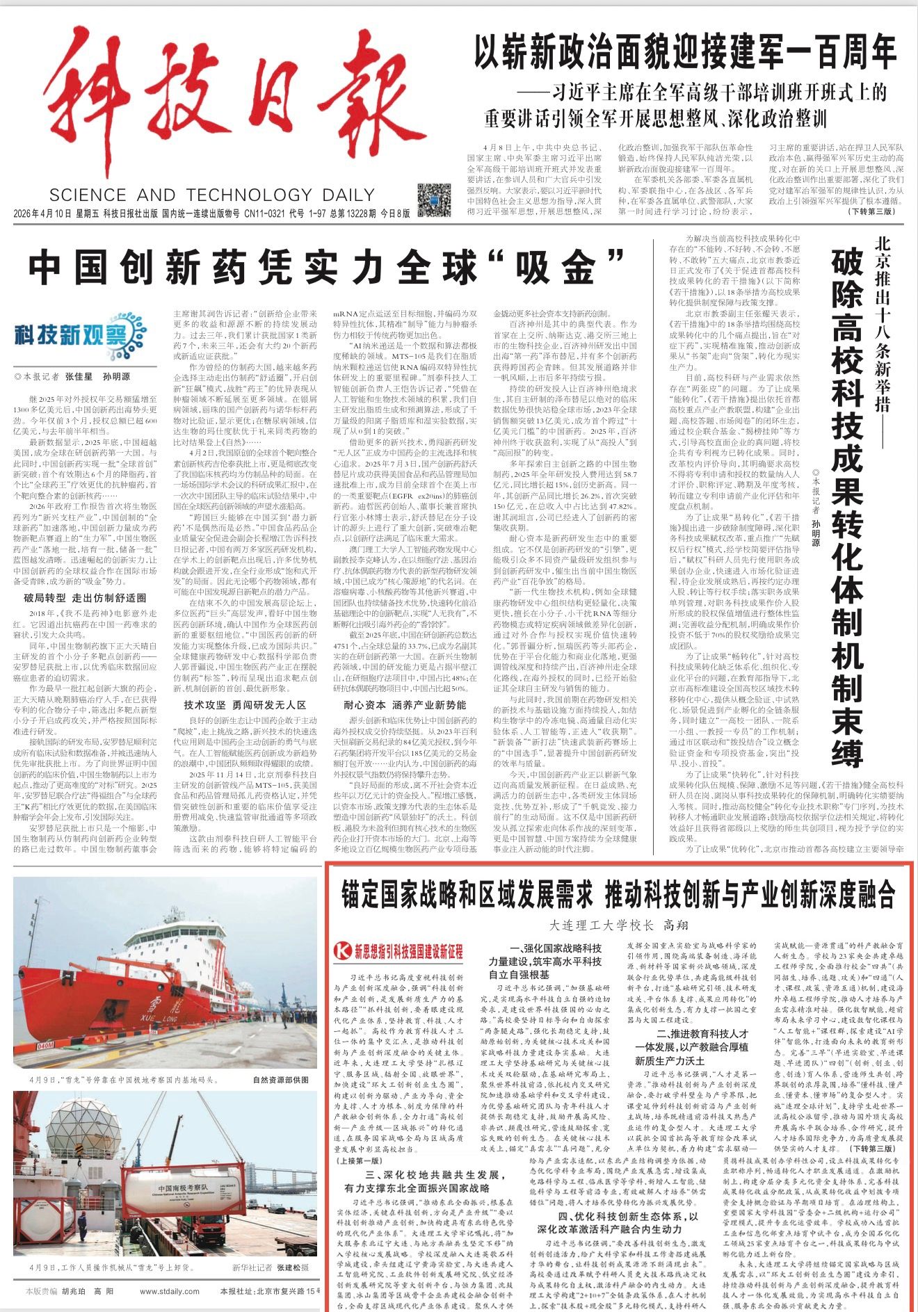 4月10日,《科技日报》头版“新思想指引科技强国建设新征程”专栏,刊发我校校长高翔署名文章《锚定国家战略和区域发展需求 推动科技创新与产业创新深度融合》,系统阐述了学校锚定国家战略与区域需求,通过强化国家战略科技力量建设、推进教育科技人才一体发展、深化校地共融共生发展、优化科技创新生态体系等方面,持续推动科技创新与产业创新深度融合,为实现高水平科技自立自强、服务东北全面振兴贡献大工力量