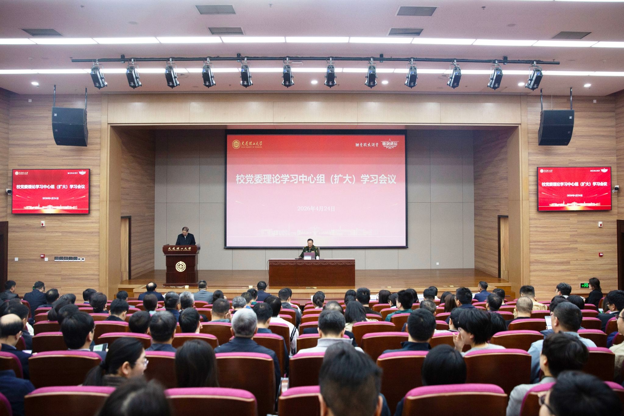 为深入学习贯彻习近平强军思想、习近平外交思想,深刻把握国际战略形势,4月24日上午,学校召开党委理论学习中心组2026年第5次(扩大)学习会议暨党校大讲堂、砺剑讲坛,邀请国防大学孟祥青教授作主题报告。校党委书记项昌乐主持会议,校长高翔讲话。