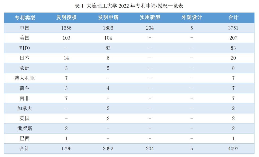 近日,大连理工大学专利简报(2022年)由大连理工大学知识产权信息服务中心(图书馆)发布。通过对学校2022年公开公告的4097件专利进行检索分析,揭示大连理工大学2022年专利情况。