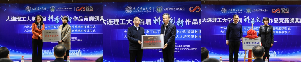 市科协杨代刚书记和唐艳霞副主席分别为大连理工大学全国科普教育基地和大连市科普共建基地授牌,商汤科技高焱副总裁同时为大连理工大学—商汤科技人工智能人才培养基地揭牌。