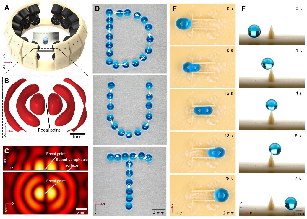 近日,我校机械工程学院刘亚华教授团队设计了一种液滴超声波镊子(droplet ultrasonic tweezer,DUT),实现了非接触式多功能液滴捕获与高效操控。基于超声相控阵技术在表面构建能够捕获液滴的双阱声场,通过改变双阱声场的位置实现了液滴可编程精准操控。其出色的操控能力使液滴能够穿过狭窄缝隙、翻越陡坡、逆重力往复运动和定向弹射等。相关成果以“Ultrasonic tweezer for multifunctional droplet manipulation”为题发表在国际期刊Science Advances上,并被选为当期封面。