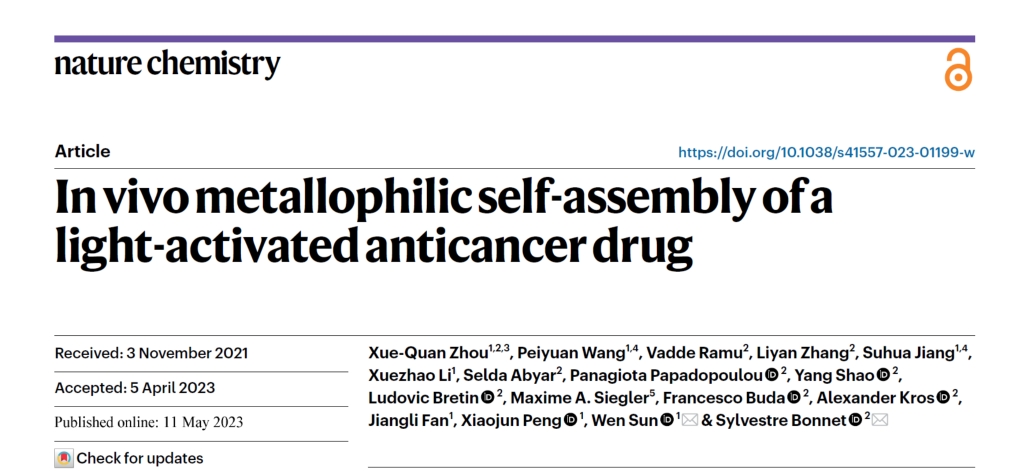 论文信息:In vivo metallophilic self-assembly of a light-activated anticancer drug, Xue-Quan Zhou, Peiyuan Wang, Vadde Ramu, Liyan Zhang, Suhua Jiang, Xuezhao Li, Selda Abyar, Panagiota Papadopoulou, Yang Shao, Ludovic Bretin, Maxime A. Siegler, Francesco Buda, Alexander Kros, Jiangli Fan, Xiaojun Peng, Wen Sun* & Sylvestre Bonnet*,nature chemistry.2023, 10.1038/s41557-023-01199-w.