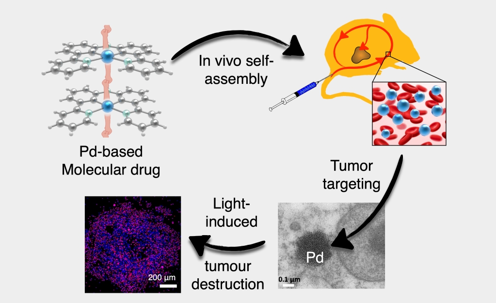该成果验证了一个简单的小分子金属配合物染料是如何利用超分子金属-金属相互作用,在活体内自组装为具有稳定结构的纳米光敏剂,以达到肿瘤的高效富集和光动力抗癌效果。其亮点在于提供了小分子可直接在活体内用作纳米药物的新思路,并将金属-金属相互作用引入纳米医学领域。
