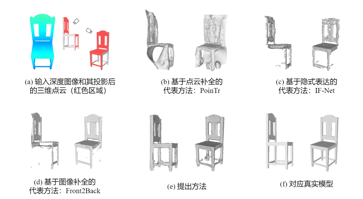 博士生张肇轩作为第一作者与博士生李童等人共同完成的研究成果“Single Depth-image 3D Reflection Symmetryand Shape Prediction”致力于通过物体的对称属性去解决单视角物体三维重建过程中细节不足的问题。从单张二维图像中去重建出三维物体模型是计算机图形学与视觉领域的一项传统而又重要的任务。相比于从单张RGB图像进行较粗糙的物体重建,单张深度图像的物体建模任务由于输入图像中蕴含深度值这一几何信息,对最终模型的精细程度及完整程度要求更高(如下图a所示,在输入物体点云——红色区域的情况下,尽可能精准地恢复出被遮挡区域——灰色区域的信息)。目前一般是利用Kinect相机或具备激光雷达的手机等设备对物体直接进行拍摄来获取深度图像。由于其2.5D的特性,通常是使用三维点云补全的方法将其重建出来,而这类方法由于显存等硬件的限制,使得算法最终输出结果的点云数量有限,难以较好的恢复出物体的细节信息,相比于被拍摄物体会存在明显的失真,如下图(b)所示。为了解决这一问题,团队采用深度图像及法向量图像联合补全的方法从二维的角度直接去预测三维点的信息,借助强化学习算法决策出最佳补全视角序列,通过法向量及对称性等几何约束,完成了物体待补全区域检测及高质量的深度、法向量等几何信息的预测,实现了更细节的三维物体重建及更精准的物体对称面预测。此项研究阐明了物体完整程度与对称面准确性间的互补关系,所提出的单视角物体重建算法可以广泛地应用于数字人、机器人交互、虚拟/增强现实等领域。
