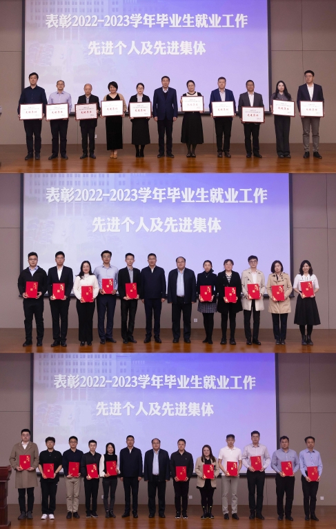 康旭东宣读2022-2023学年就业工作先进集体和个人名单。项昌乐为荣获就业工作先进集体奖的单位颁奖,韩轶、王志伟为荣获就业工作先进个人的代表颁奖。