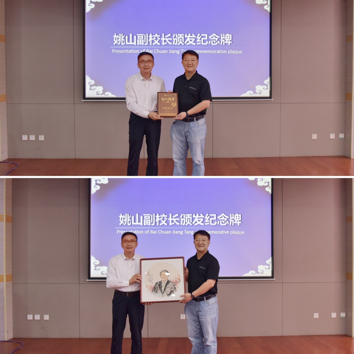 讲座结束,姚山代表学校为李相烨颁发“百川讲堂”纪念牌,并送上我校学生绘制的国画肖像画,以表感谢与敬意。