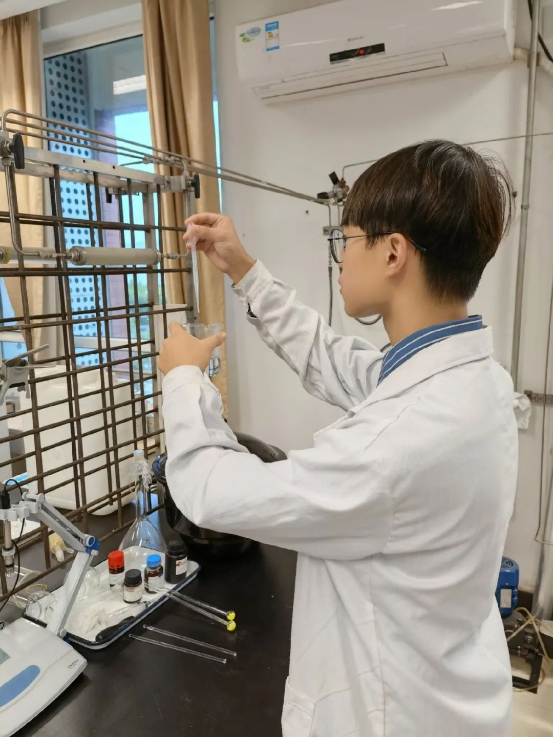 尽管专业知识的积累已经为周志峰打下了坚实的理论基础,但缺少实践经验是他遇到的又一道坎,比如因操作手法不当造成的产物损失,也曾让他手足无措。但周志峰并不气馁,他经常在实验室从下午一点待到晚上八九点,在一次次的操作练习中,不断总结经验,提高实验能力。最终,周志峰与团队研发出了一种新的成核剂,其研究成果《一类新型高效聚乳酸成核剂及其制备方法与应用》专利在申。现在早已能独立完成实验的他,还经常辅助导师完成任务,成为了导师的好帮手。看到周志峰的成长,同课题组的师兄程屹十分欣慰,特地为他写了一首诗:“睥睨开天地,囊收万世功。飘鹞终问鼎,倚剑贯长虹。”同时,为了培养自己的创新精神,周志峰还积极参与数学建模、数学竞赛、“互联网+”等比赛,并斩获2项国家级奖项、8项校级奖项。