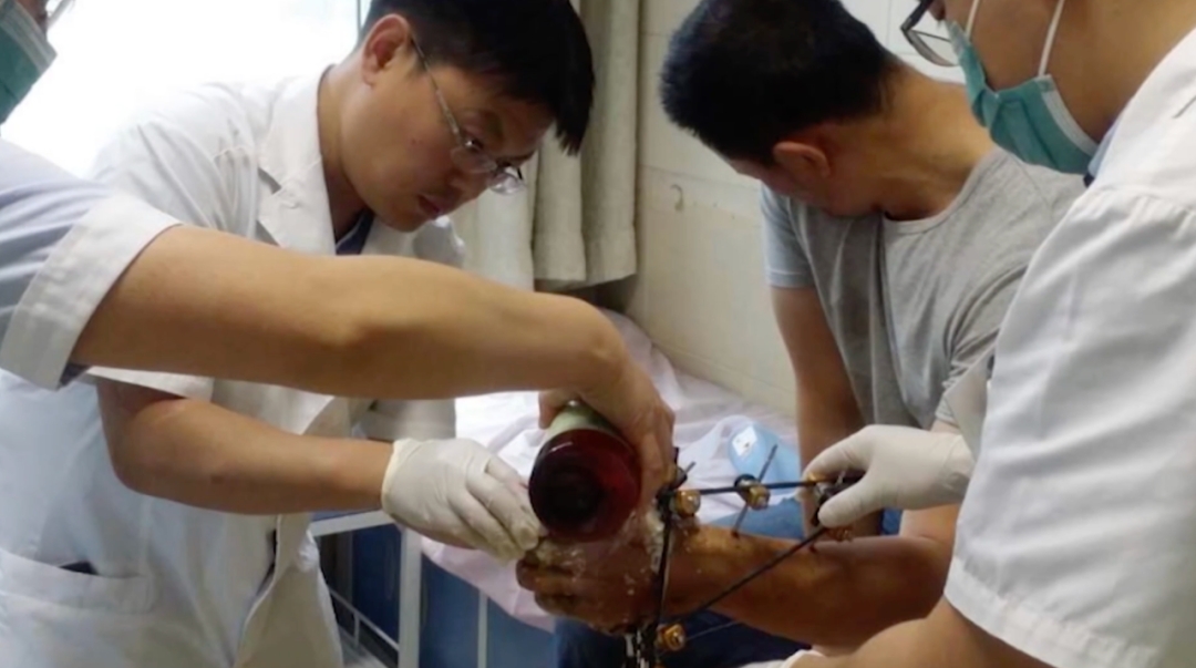 千钧一发手接爆炸物 左手被炸得血肉模糊
