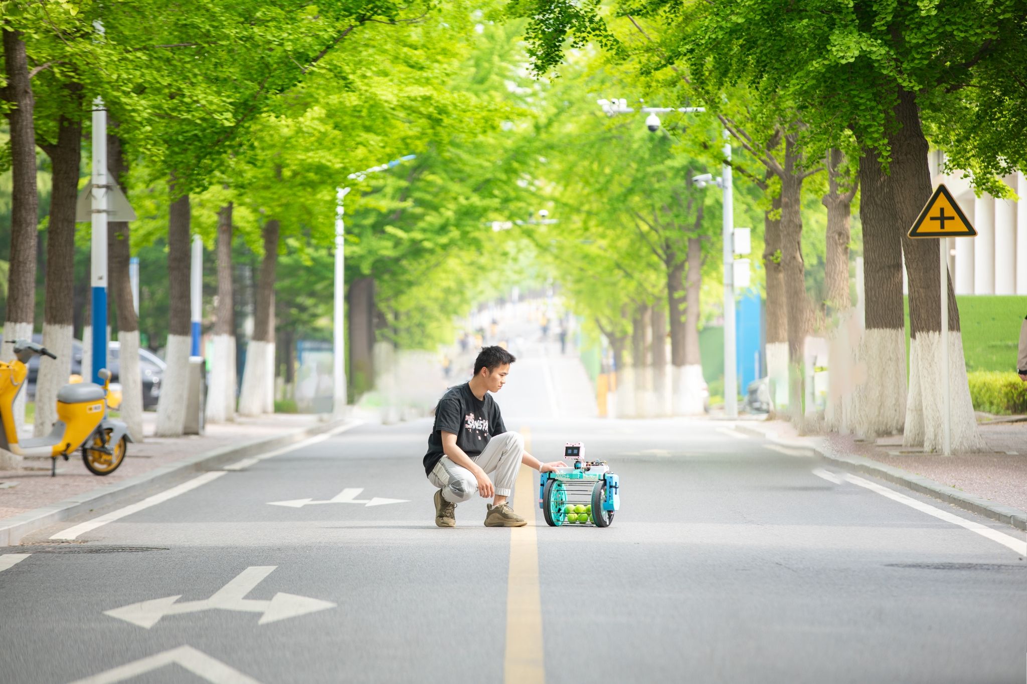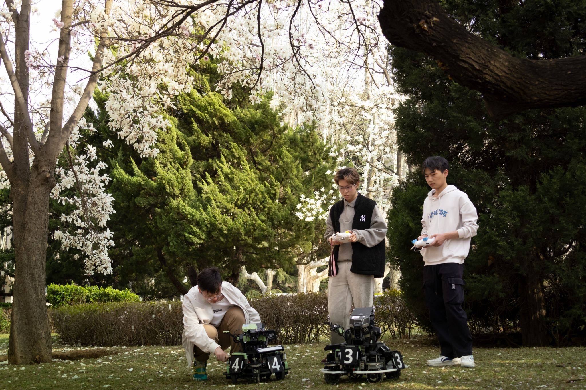 • 凌BUG机甲大师战队在玉兰花下调试robomaster机甲大师赛场上的步兵机器人。(图片作者/刘嘉瑞)