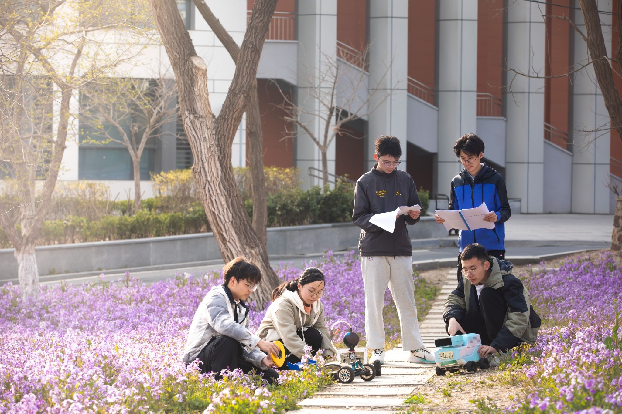 • Chem-E-Car社团成员在花丛中调试其自主研发制备的以化学电池为动力、利用化学反应进程进行行止控制的智能车。(图片作者/刘嘉瑞)
