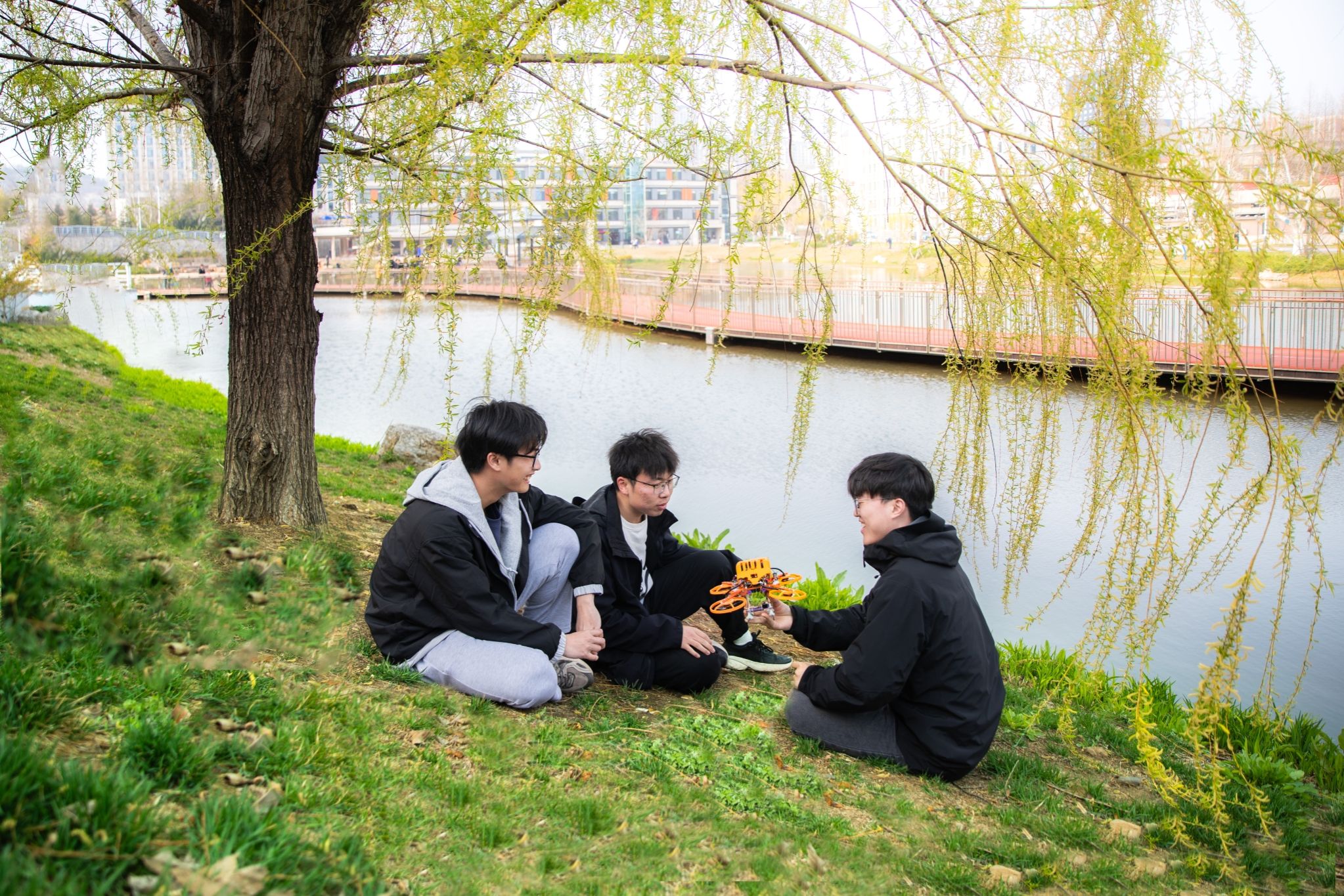 • 多自由度陆空两栖可变形无人机队友在河边春色共同探讨无人机的进一步可能。(图片作者/郑家润)