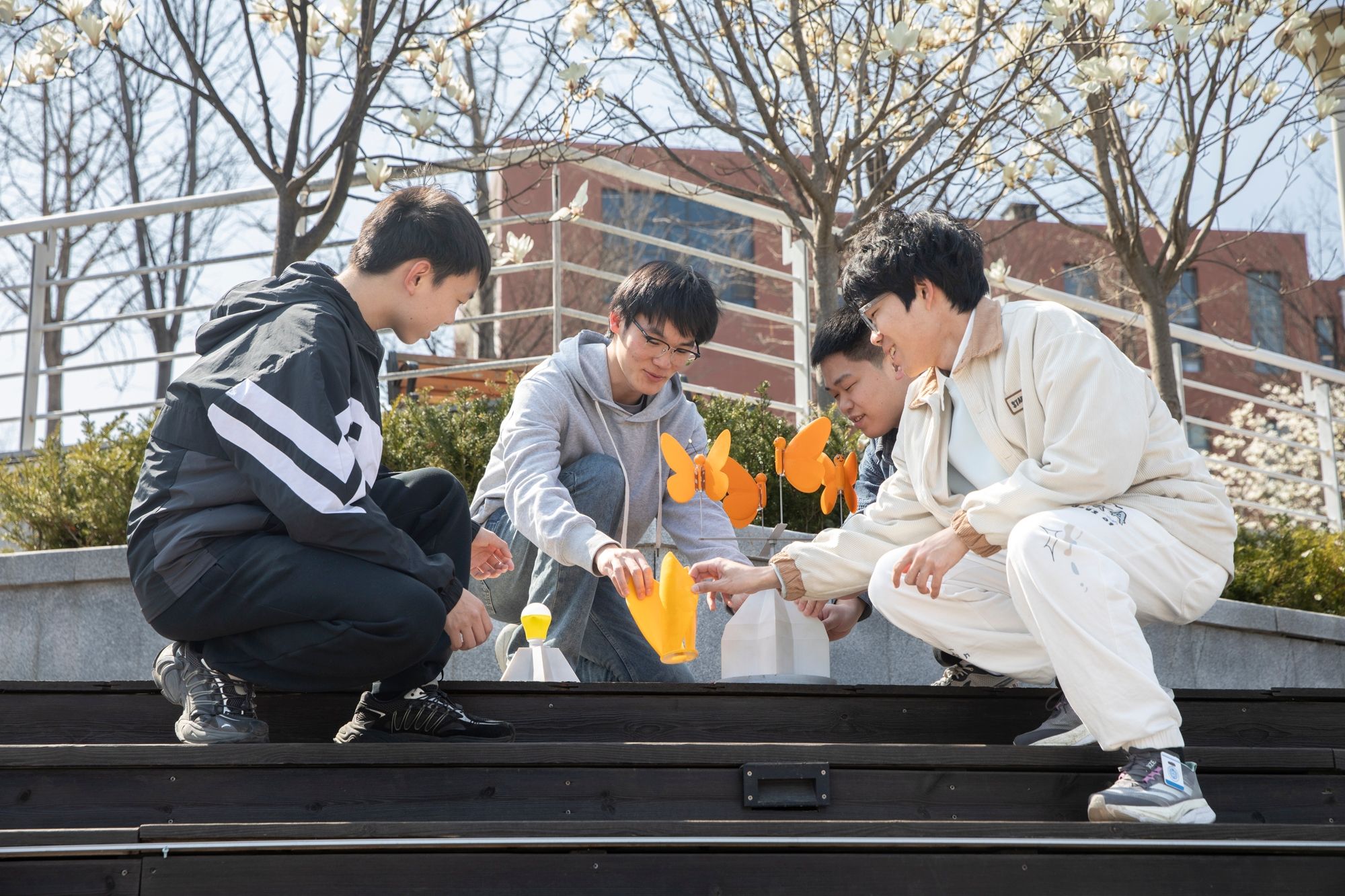 蝴蝶风机团队在玉兰花下讨论改进新方案。(图片作者/李梦瑶)