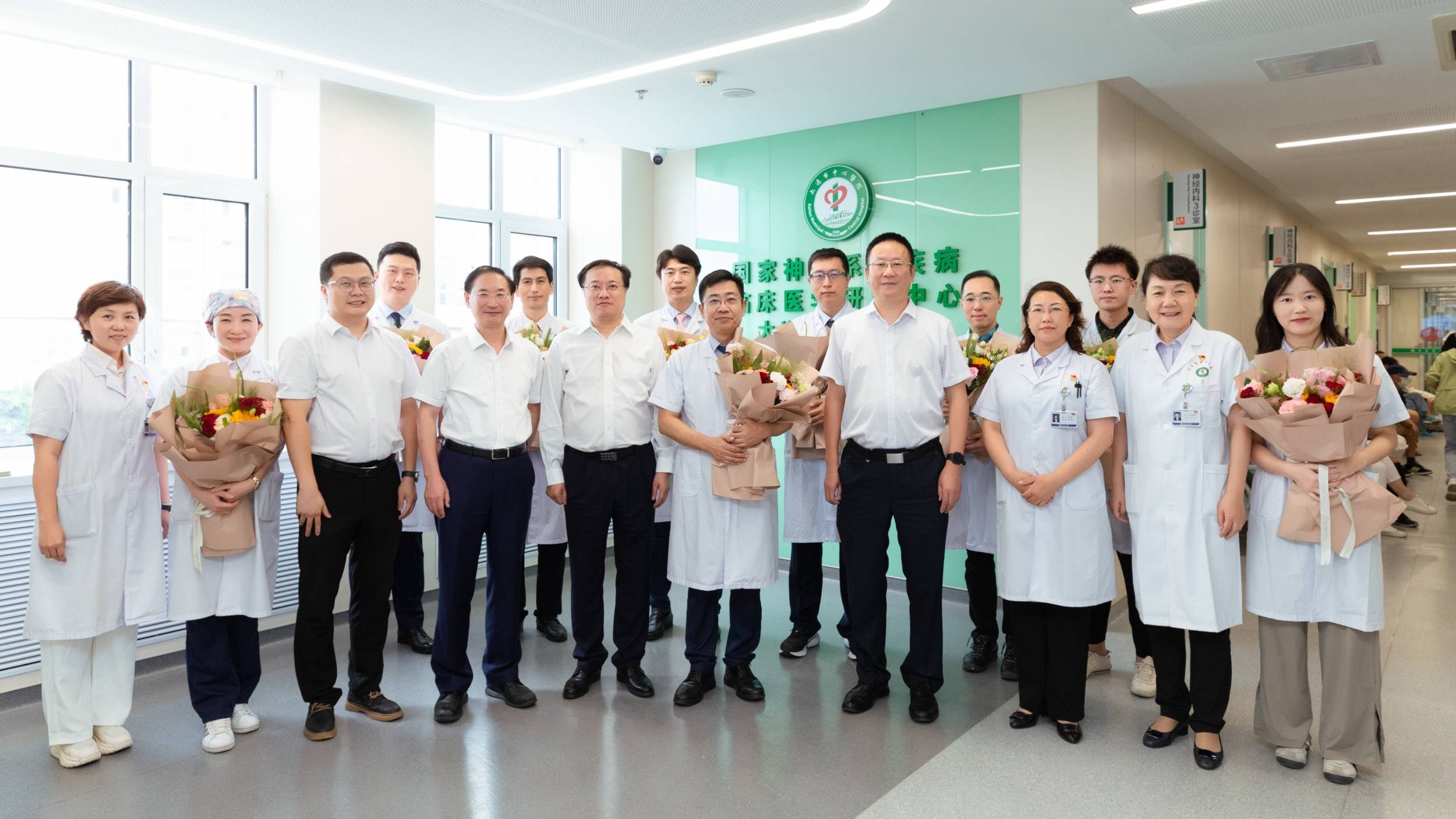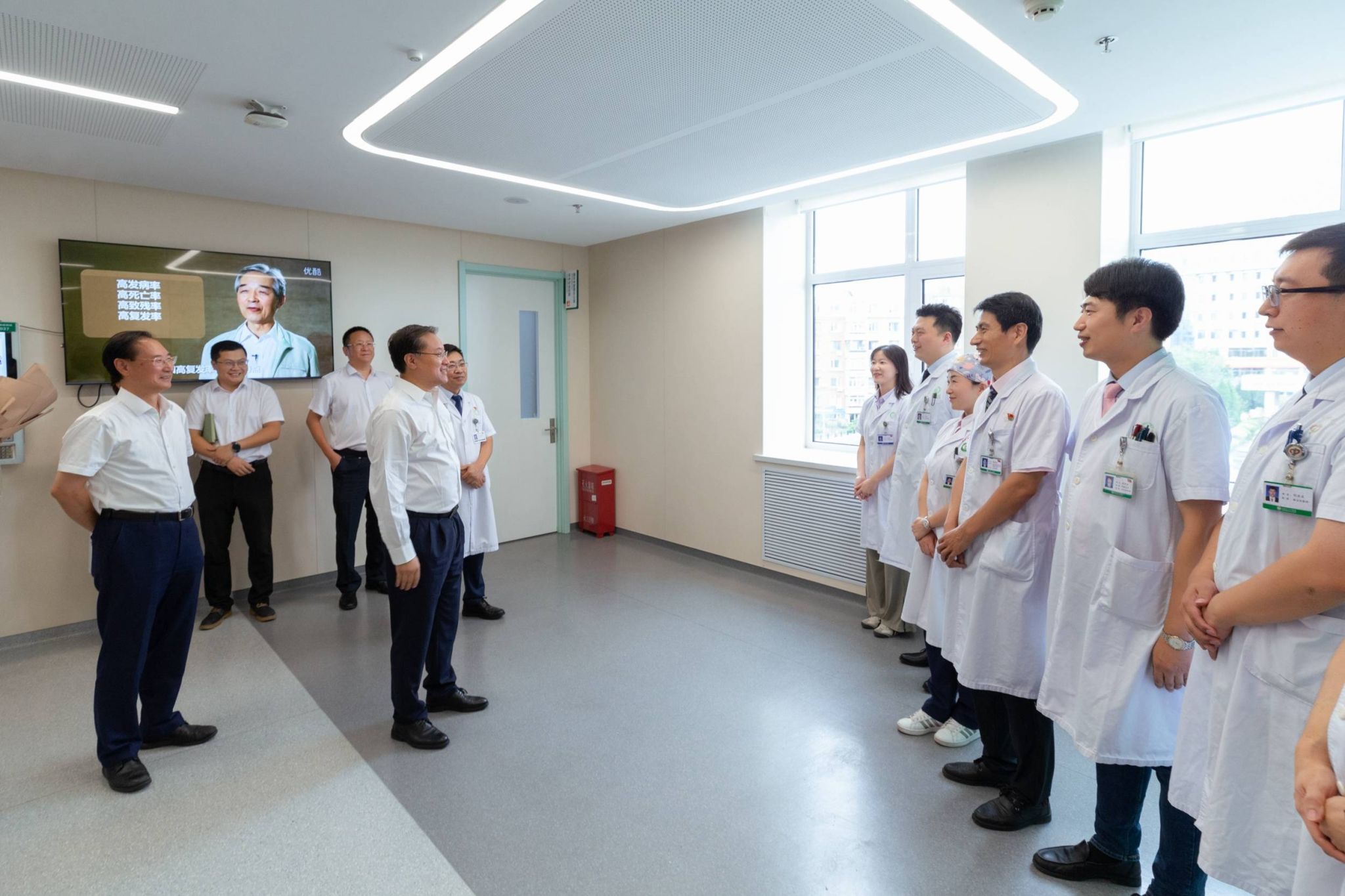 宋丹一行实地考察了附属中心医院北院区综合楼项目、南院区发热门诊综合楼项目、入院准备中心、乳腺疾病诊疗中心、神经医学中心、门诊大厅患者服务中心、生物样本库等,深入了解医院在高质量发展中做出的改革创新成果和惠民实效,并在院区神经医学中心举行了简短而温馨的教师节慰问活动。宋丹代表学校,向奋战在临床一线的教师代表送上了诚挚的节日问候和崇高的敬意。他表示,临床教师们不仅承担着传授医学知识和技能的神圣使命,更为培养优秀医学人才、推动医院高质量发展发挥着重要作用。中心医院的教师们以高尚的师德、精湛的医术和无私的奉献精神,为学生们树立了榜样。