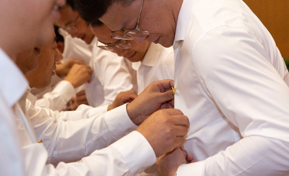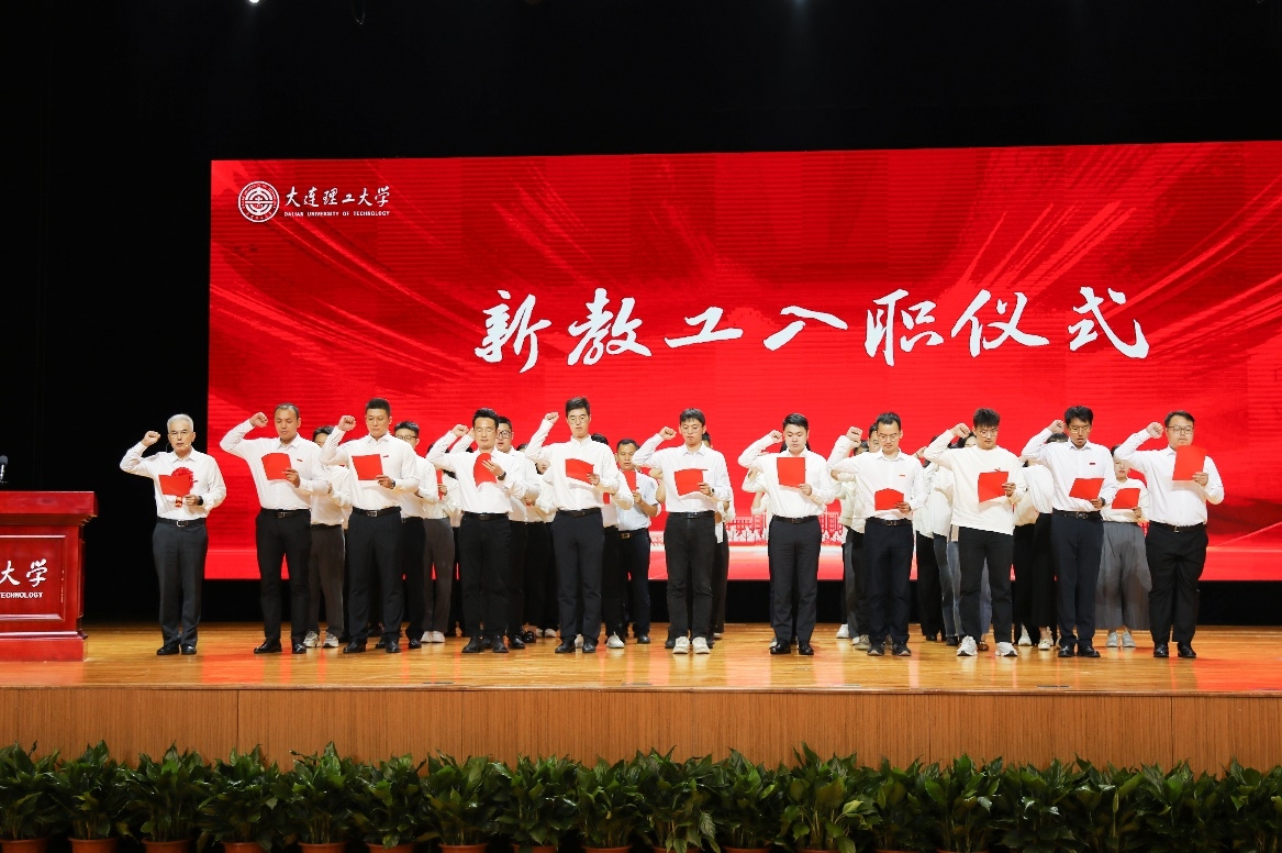 近一年,学校又迎来了197位新教工,为学校发展注入了新动力、新活力。参会领导、从教40年教师代表为新教工代表佩戴校徽。辽宁省优秀教师、建设工程学院杨庆教授带领新教工进行入职宣誓。