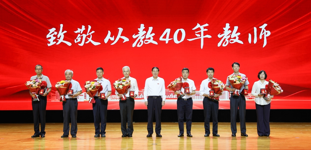 校党委书记项昌乐为从教40年教师代表颁发纪念章,校长贾振元为荣休教职工代表颁发纪念牌,感谢他们对学校建设和教育事业的辛勤付出和卓越贡献。
