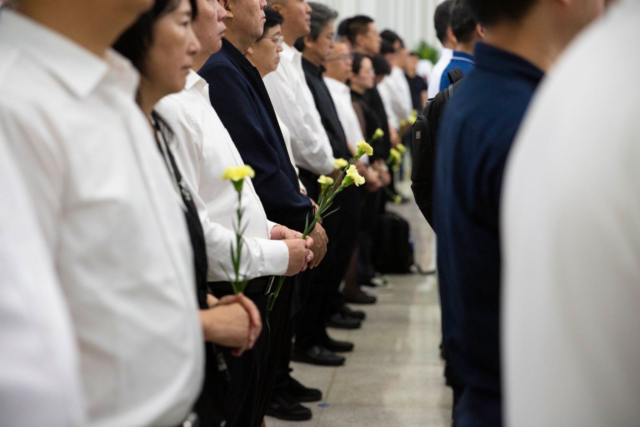 告别仪式现场,两院院士张建云、缪昌文、聂建国、胡春宏、郝洪、朱合华、杜修力、张宗亮、胡亚安、唐洪武、周创兵、刘汉龙、李清泉、彭孝军,及澳大利亚技术科学与工程院程亮院士;辽宁省政协市县政协联络指导委员会副主任马辉,辽宁省委组织部部务委员王玉辉,大连市政府驻沪办主任刘龙邦,大连市委组织部副部长任洪成,大连市科学技术局副局长杨怀军;华东理工大学原校长、党委原副书记曲景平,河海大学原常务副校长李俊杰,同济大学副校长娄永琪,中国人民解放军陆军工程大学副校长方秦;中国水力发电工程学会副秘书长席浩,中国大坝工程学会原副理事长贾金生,南京水利科学研究院原院长陈生水,三峡集团上海勘测设计研究院有限公司董事长蔡玮良,中国电力建设集团有限公司原总工宗敦峰,中国电力建设集团有限公司首席科学家张春生,中国水力发电工程学会名誉副理事长龚和平,中国水利水电科学研究院副院长刘毅,水电水利规划设计总院副院长王富强,长江设计集团有限公司总工程师崔玉柱,中国电建集团华东勘测设计研究院有限公司党委副书记杜运领,三峡集团上海勘测设计研究院有限公司党委副书记陈宗清、首席专业师陆忠民;上海长海医院重症医学科主任万小健,原武警部队吉林省森林总队战友代表金铁炎;大连理工大学校领导项昌乐、贾振元、朱方伟、张弛,离任领导宋永臣、朱泓,及相关部处、学院负责同志,教师代表、学生代表、校友代表,家乡代表等各界人士以及孔宪京院士的亲属和生前友好、学生等怀着沉痛的心情,前来为孔宪京院士送行。