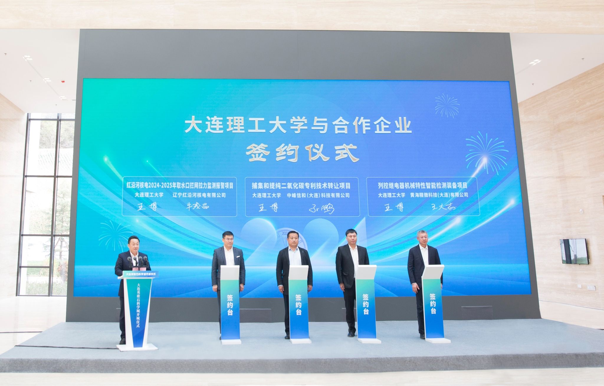 仪式上,我校副校长王博与辽宁红沿河核电有限公司、中峰信和(大连)科技有限公司、黄海精微科技(大连)有限公司签署项目合作协议。