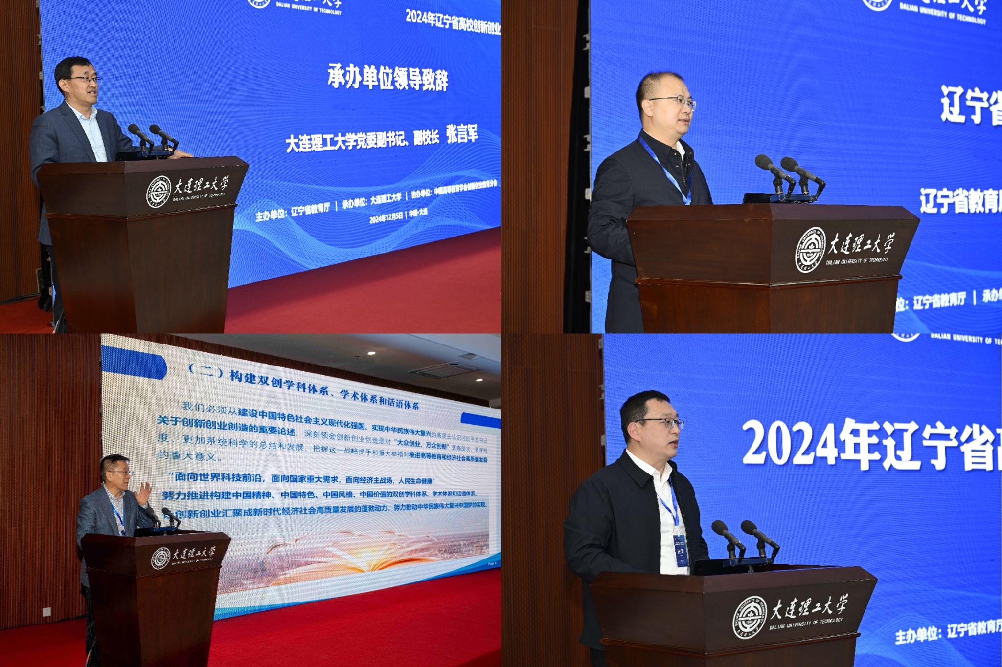12月5日,2024年辽宁省高校创新创业教育工作推进会在我校举办。会议贯彻落实全国教育大会及全省教育大会精神,通过专题报告、国赛金奖项目复盘展演等活动,加强交流合作、促进经验互鉴、强化资源共享,进一步深化高校创新创业教育改革。我校党委副书记、副校长张言军,中国高等教育学会创新创业分会副理事长刘铸,辽宁省教育厅高等教育处处长胡承波出席会议并致辞。辽宁省96所高校创新创业教育工作部门负责人等160余名代表参会。我校创新创业学院院长刘新主持会议。