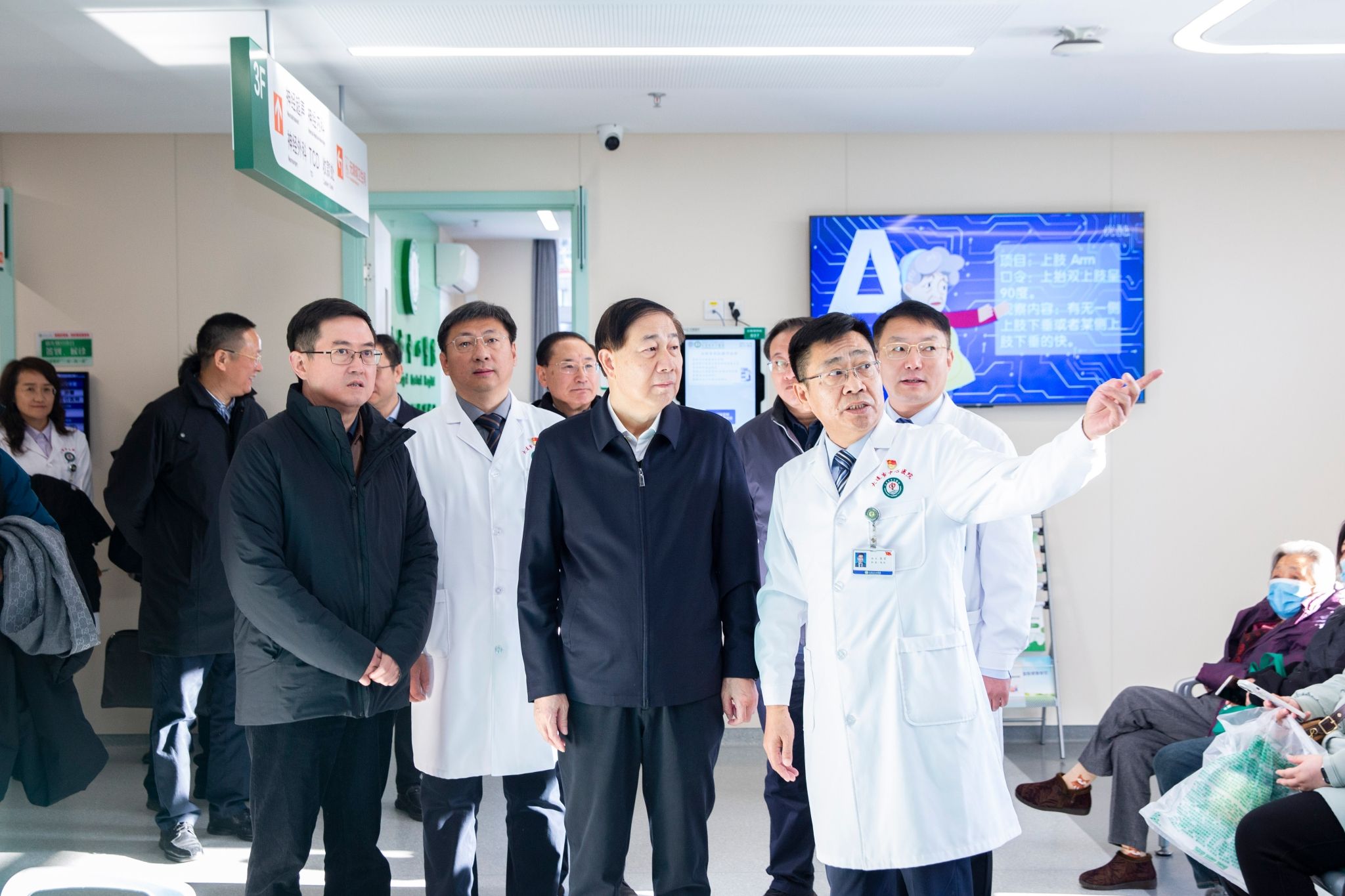 项昌乐一行先后到医院急诊医学中心、神经医学中心、入院准备中心、呼吸内镜诊疗中心、院史馆以及正在建设中的北院区综合楼项目等地进行实地调研,深入了解医院在学科建设、医疗技术、人才培养等方面的情况。