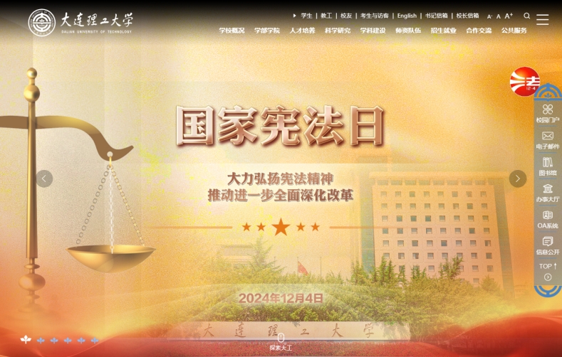 全校各类宣传阵地开展了全方位的法治宣传工作,形成了多层次、渗透式的宣传格局。学校网站主页设置“国家宪法日”主题大图,各食堂全天滚动播放宪法宣传片,各基层单位利用条幅标语、电子屏、专题展板、新媒体平台等阵地营造宪法宣传氛围。学校理论学习官方微信“大工微理论”普及宪法知识,引导广大师生坚定维护宪法权威。