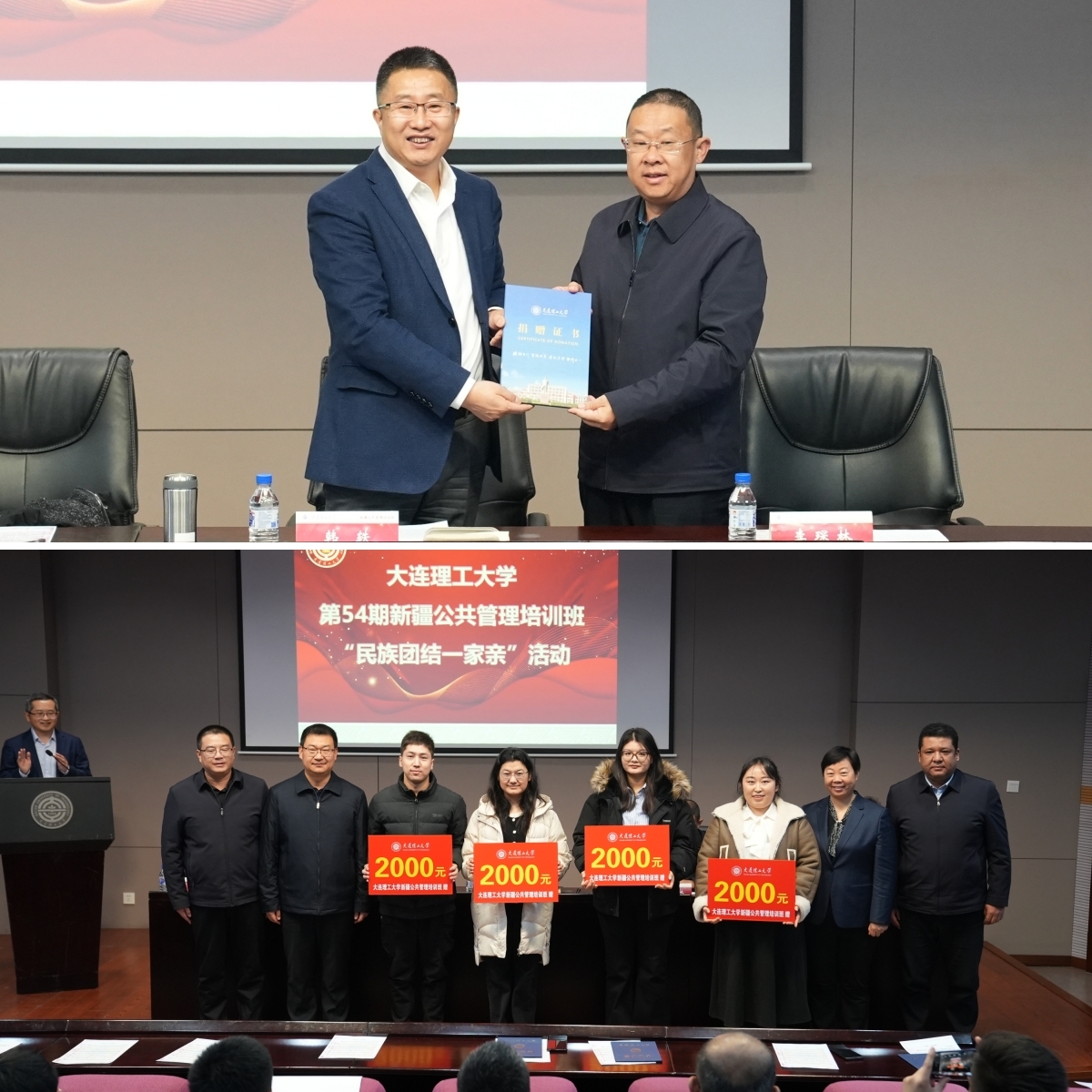 会上,韩轶、王欢明为新疆班学员代表颁发结业证书。韩轶向新疆班临时党支部书记李琛林颁发捐赠证书。