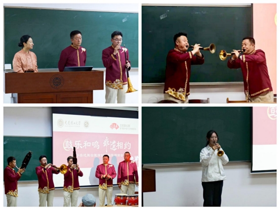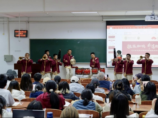 在互动环节中,同学们踊跃发言,刘家齐等几位同学就辽宁非遗文化的传承与创新等问题与苏娅倩老师进行深入交流。校民乐团关佳媛同学进行了唢呐表演,乐团老师们为其即兴伴奏并给予高度肯定,现场气氛再次被点燃。邴姝赫同学说道:“非遗是民族的根与魂,承载着先辈们的智慧结晶与情感记忆。在时代浪潮中,我们每个人都应成为非遗的守护者与传播者。”