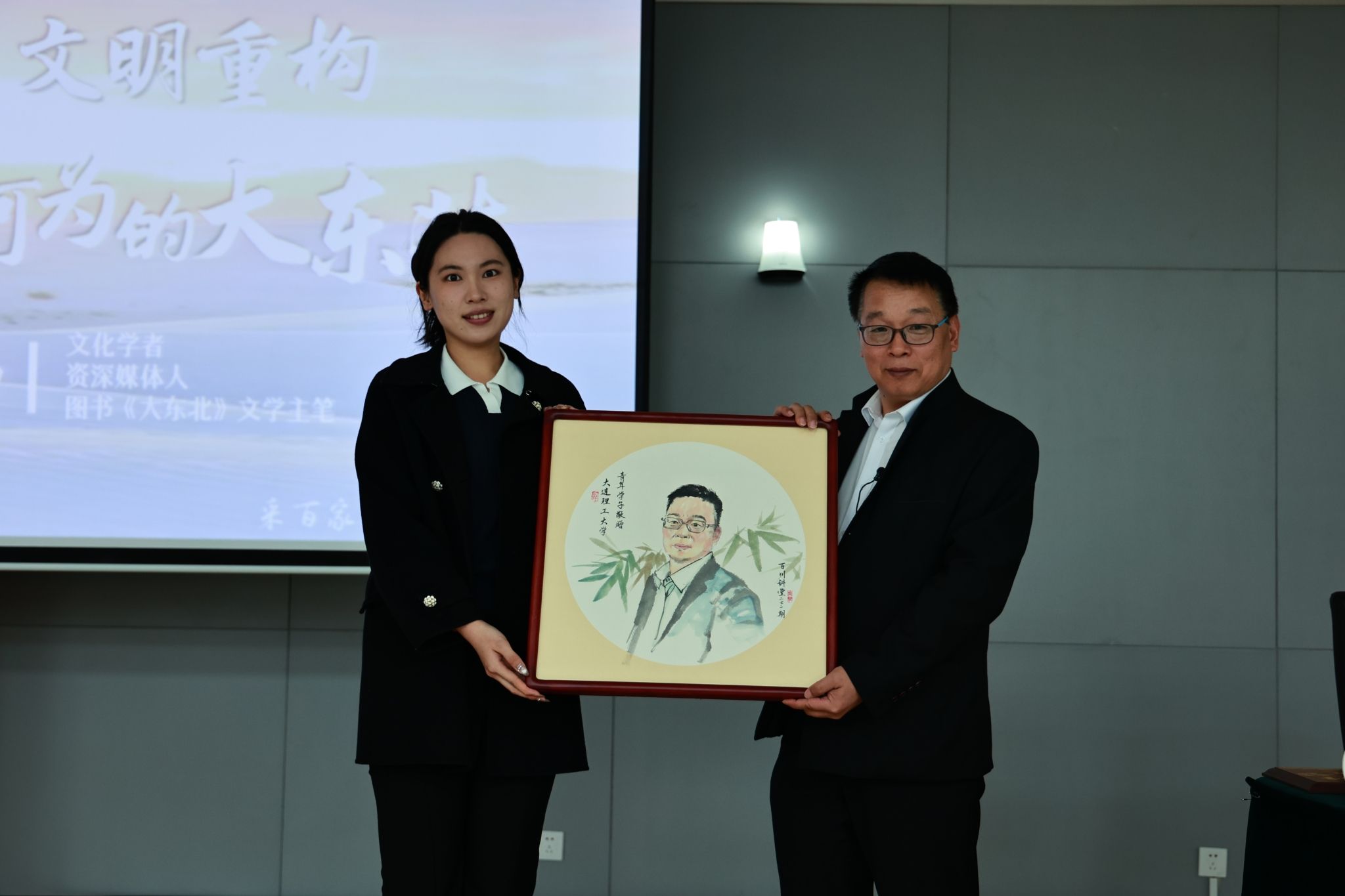 讲座结束后,韩轶代表学校为白玮颁发“百川讲堂”纪念牌,学生代表赠送国画肖像,以表感谢与敬意。