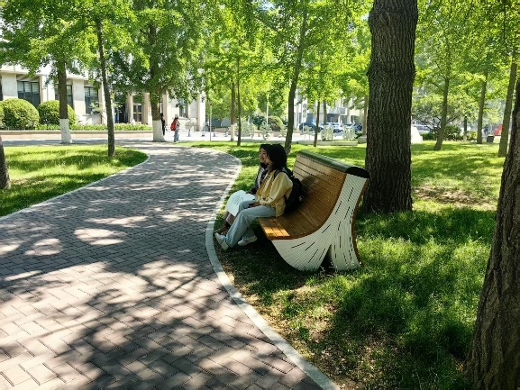 在玉兰大道基础上,新建玉兰树阵,以自然与人文双重基因为校园注入诗意与情怀。在劳服楼西侧沿线新栽植31株玉兰树(白玉兰4棵,紫玉兰27棵),傲然挺立,共同构成“玉兰观湖”的核心轴线,其中一棵为2011级校友捐赠,成为校友情系母校的鲜活印记。树下新设书型座椅以翻页造型融入草坪,学生可倚坐阅读休憩,远眺凌水湖,让花香与书卷气浸润校园。