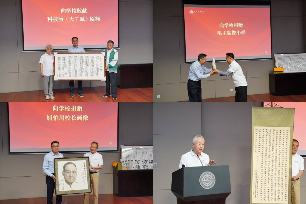 校友陈仰东为母校捐赠精心创作的科技版《大工赋》匾额,并由胡薇校友深情朗诵,献上精神礼赞;65级梁茂鸿校友捐赠珍藏近60年的主楼毛主席像设计小样,当年照片及手写回忆录,填补校史空白;校友王连林献上屈伯川校长画像,校友何忠振手书屈校长事迹、刘明哲现场诵读。校友们的历史记忆,在这一刻化作具象的珍藏。