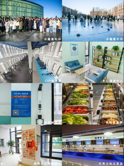 校区高度重视师生身心健康,继完善校区医疗保障条件和对室外运动场地进行了全面修缮升级后,充分利用校区水系环境和气候资源特色,于2024年冬季打造了校区冰上运动项目并开展校区首届“冰趣嘉年华”,得到了央视的关注和报道;于2024年下半年在C09启动校区身心健康中心建设,打造高品质健身房、心理咨询室。此外,校区在食堂和宿舍等处设置健康秤,增设轻食减脂餐,菜品中英文标注名字、营养成分和卡路里;在关键楼宇和运动场所增设便携式医用除颤仪(AED)、医药箱和工具箱等。这些举措的实施,不仅大幅提升校区环境质量,更倡导师生践行绿色、健康的生活方式。