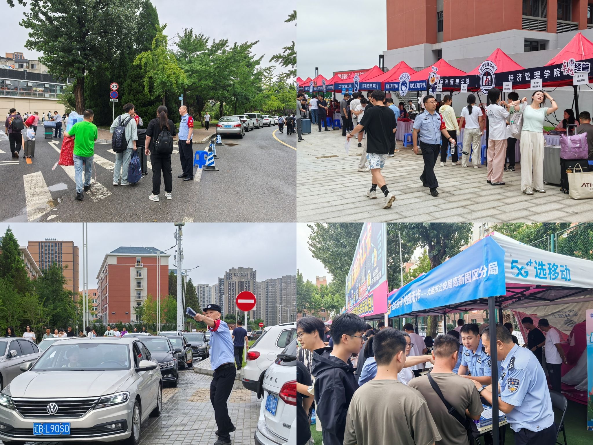 8月30日早6时30分,保卫人员已在校门及各重点路口就位,做好路线指引与安全提醒。各新生报到点均设置治安管理岗和交通管理岗,确保周边治安秩序稳定,保障车辆进出畅通。迎新当日,3500余辆送新生车辆进校,执勤人员沿线指引、耐心疏导,引导自驾车辆有序停放,有力保障校园道路交通安全、有序、畅通。网络巡查队、机动应急队、消防维保队全天候紧盯校园重点部位,及时应对各类突发情况。大连市公安局高新园区公安分局助力新生安全教育,在西山福佳足球场开设反诈宣讲点,发放反诈宣防一封信,邀请新生加入“大连理工大学反诈小组”,开启预警守护。