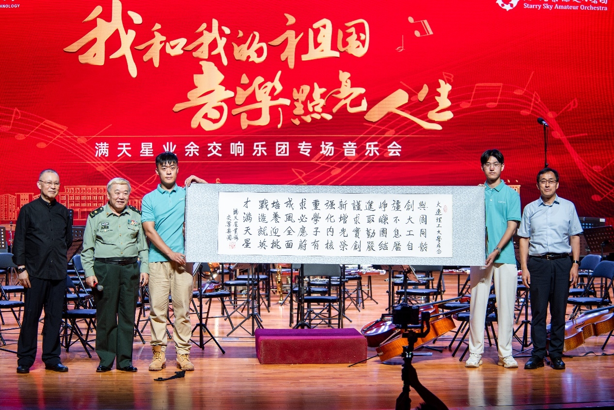 音乐会上,乐团还向学校赠送了专门为大工赋诗创作的书法作品,张言军代表学校接受赠送。