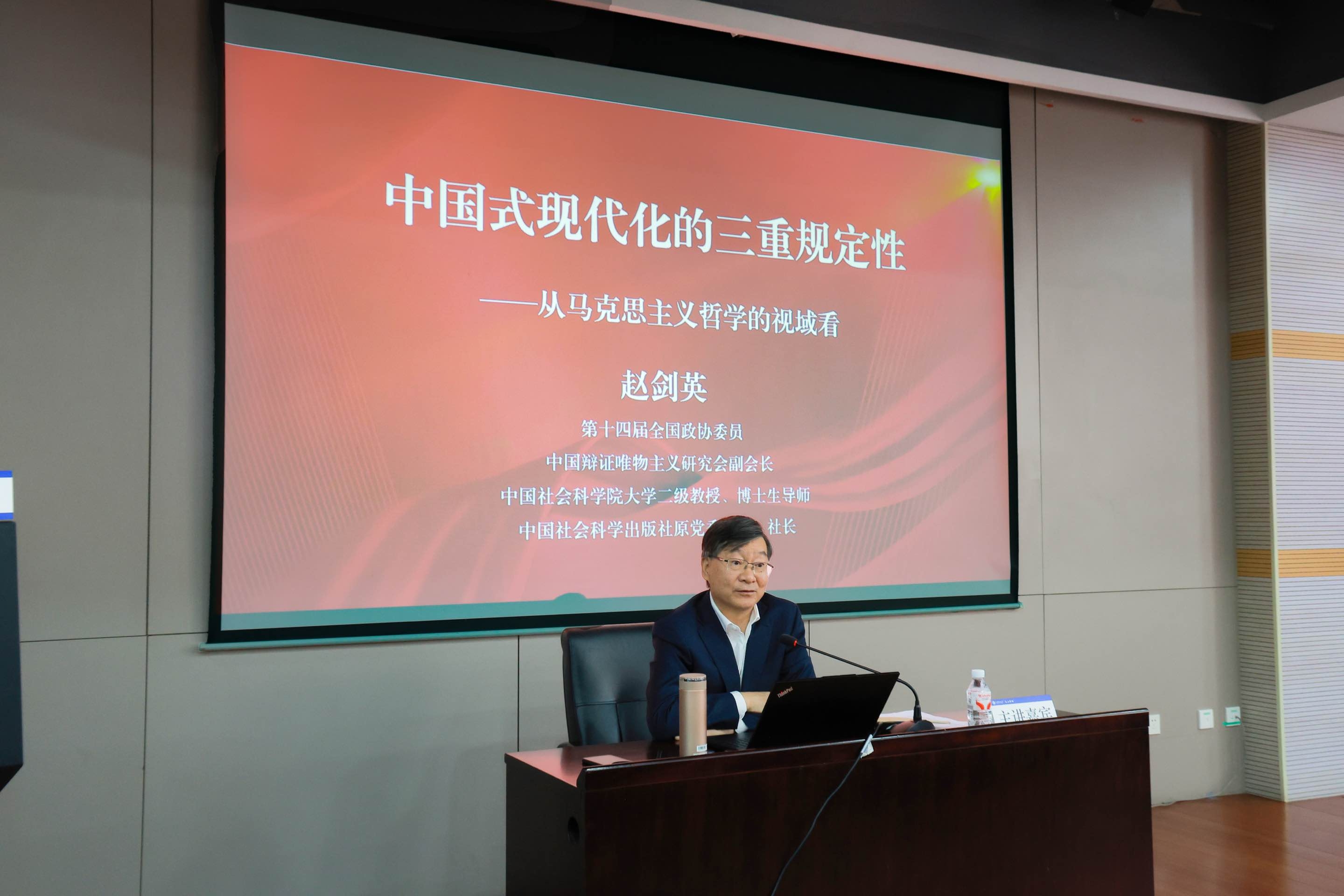10月13日下午,由党委宣传部指导、人文学院承办的“大工讲坛”学术报告会于主楼第二报告厅会议室举行。第十四届全国政协委员、中国辩证唯物主义研究会副会长、中国社会科学院大学二级教授、博士生导师赵剑英教授应邀担任主讲,围绕“中国式现代化的三重规定性”作专题报告,为在场师生带来一场思想深刻、内容丰富的学术盛宴。人文学院党委书记张远航教授主持报告会。