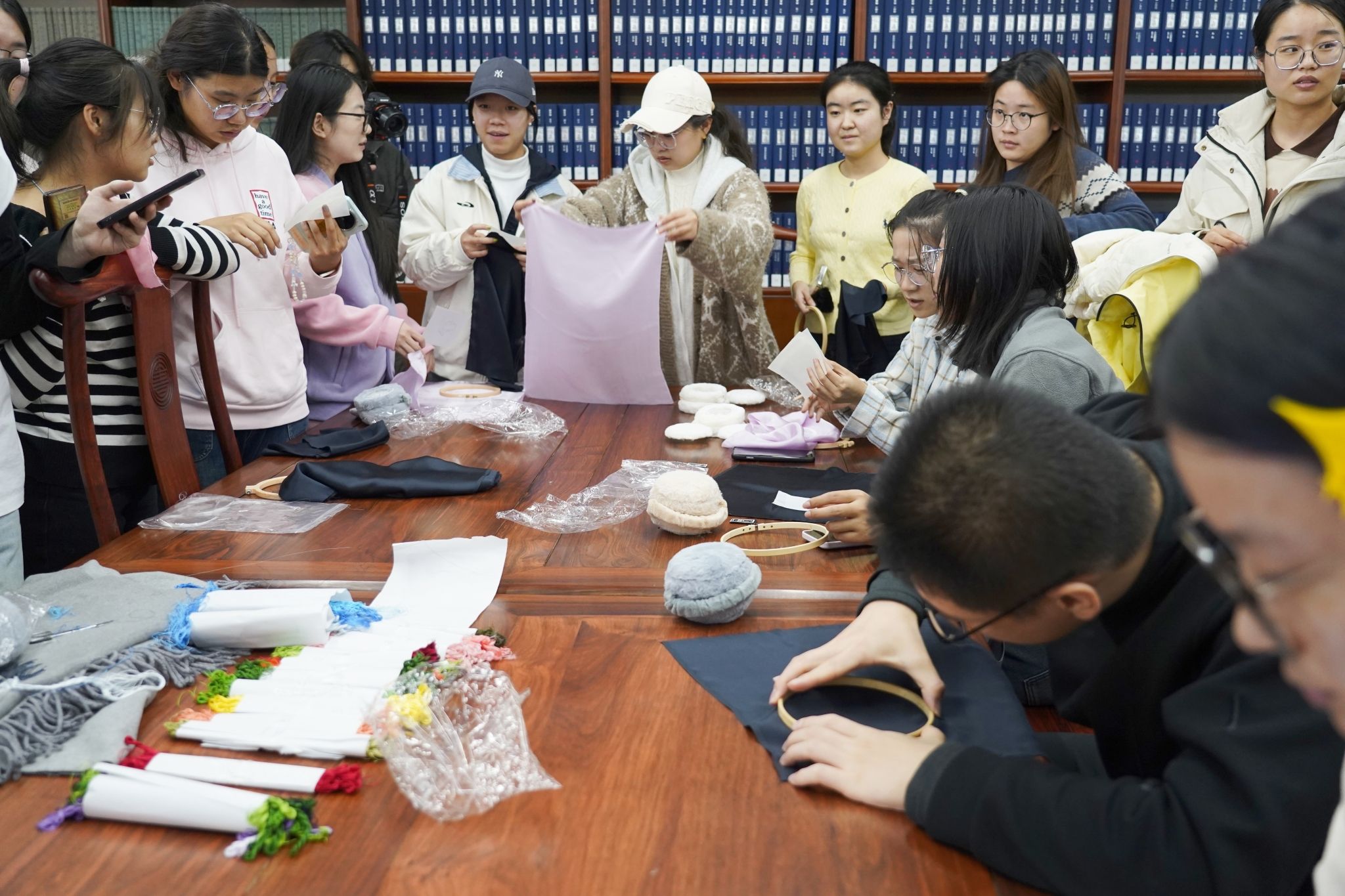 10月21日下午,由党委宣传部主办、建筑与艺术学院承办、图书馆协办的文苑第84期“匠心中华”满族传统服饰“暖耳”刺绣非遗工坊活动在伯川图书馆凌水书屋举办。工坊邀请满族刺绣省级非物质文化遗产代表性传承人吴立梅及其弟子陈素香走进校园,带领学生亲手完成“暖耳”刺绣,沉浸式体验满族传统服饰的魅力所在。建筑与艺术学院副院长马辉教授、建筑与艺术学院耿阳副教授与近30位来自不同专业的学生共同参与此次活动。