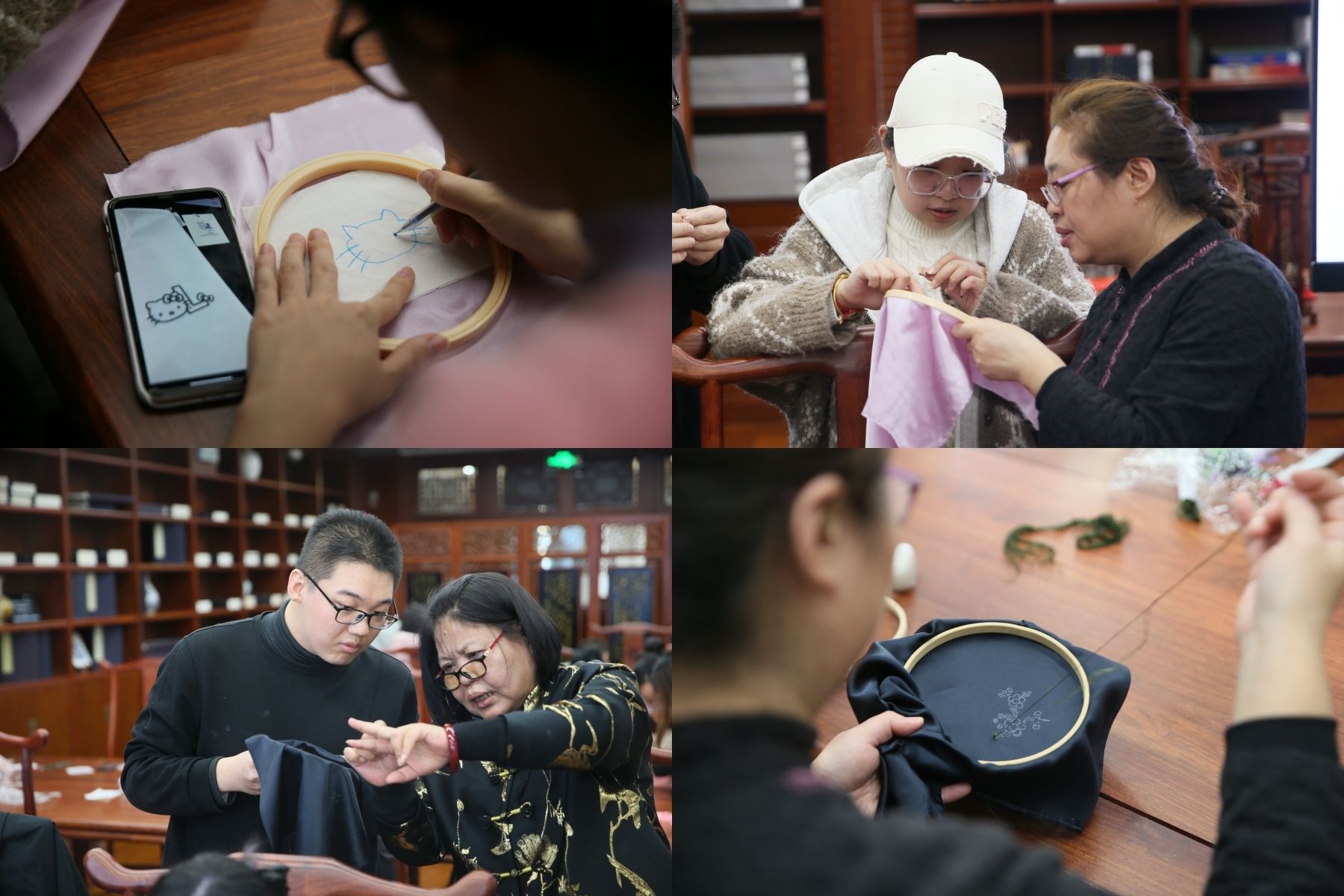 在“技艺感受”环节,吴立梅老师为大家细致介绍了刺绣“暖耳”的制作过程,从画纹、透图、绷布到认针、起针、锁针,在传承人老师们的现场示范与悉心指导下,同学们拿起银针与绣布,按照步骤绣制暖耳上的刺绣装饰图案,制作属于自己的暖耳,在一针一线中感受着刺绣非遗文化的独特魅力。
